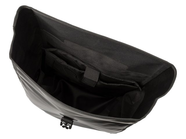 Achterin het ruime hoofdvak van de fietsrugtas bevindt zich een gewatteerd laptopvak, geschikt voor de meeste 14 inch laptops. Op de voorkant van dit laptopvak zitten twee kleine steekvakjes. Het hoofdvak sluit met een rolltopsluiting en een band met een klikgesp. De reflecterende AGU-logo's op de zijkanten zorgen voor een goede zichtbaarheid in het verkeer. Voor extra veiligheid kan er bovendien een lichtje worden bevestigd aan de lus op de voorkant van de tas.