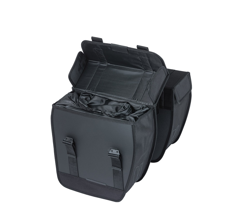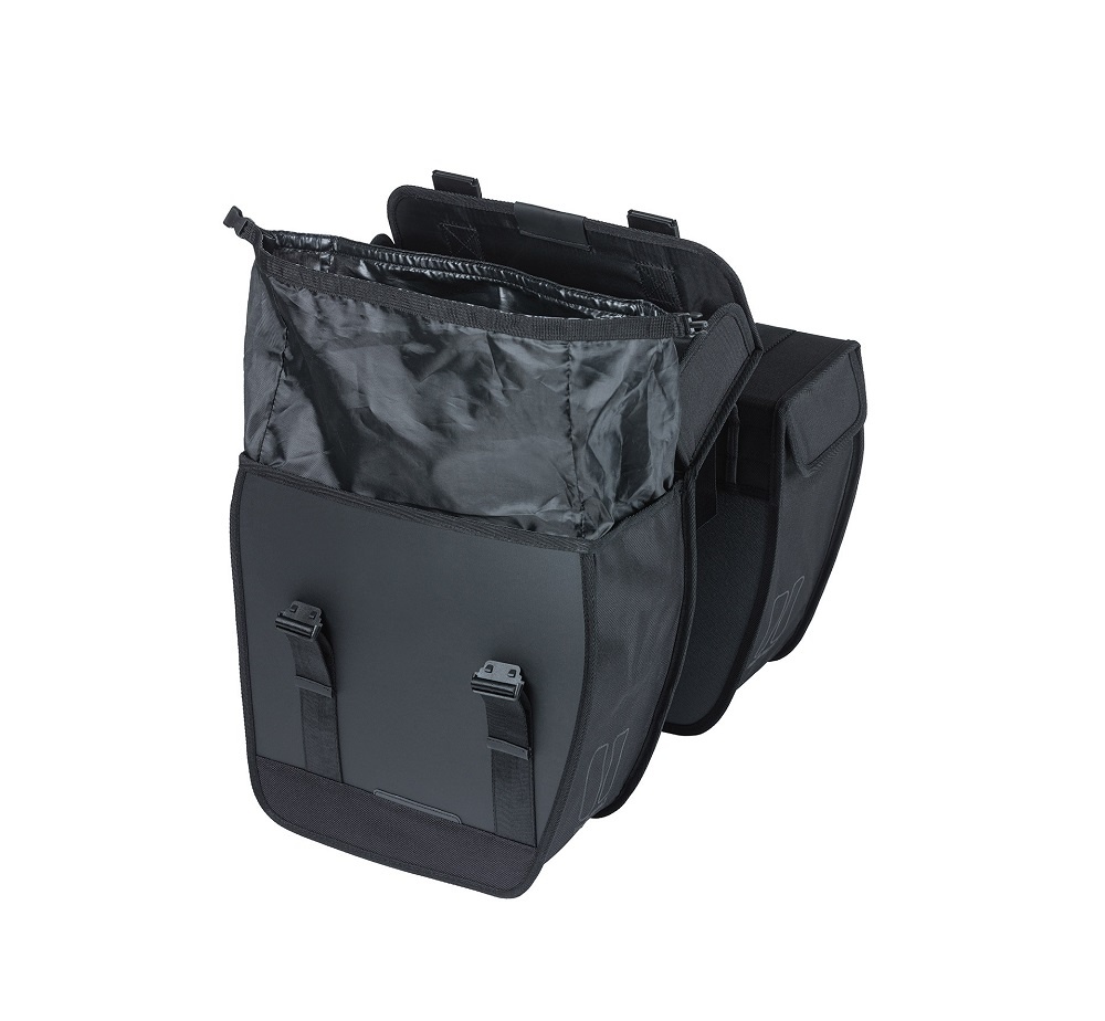 Fietstas Tour van Basil is vernieuwd! De dubbele zwarte fietstas is extra stevig en heeft een inhoud van 28 liter. De fietstas heeft afgeschuinde zijkanten, zodat u makkelijker kunt trappen zonder tegen uw tas te komen. Nieuw aan de tas zijn de eenvoudig bedienbare klikgespen, de ton-sur-ton-reflectie en bevestiging met het MIK-systeem. Bovendien is deze Tour waterdicht (IPX3), dankzij het gebruikte materiaal.