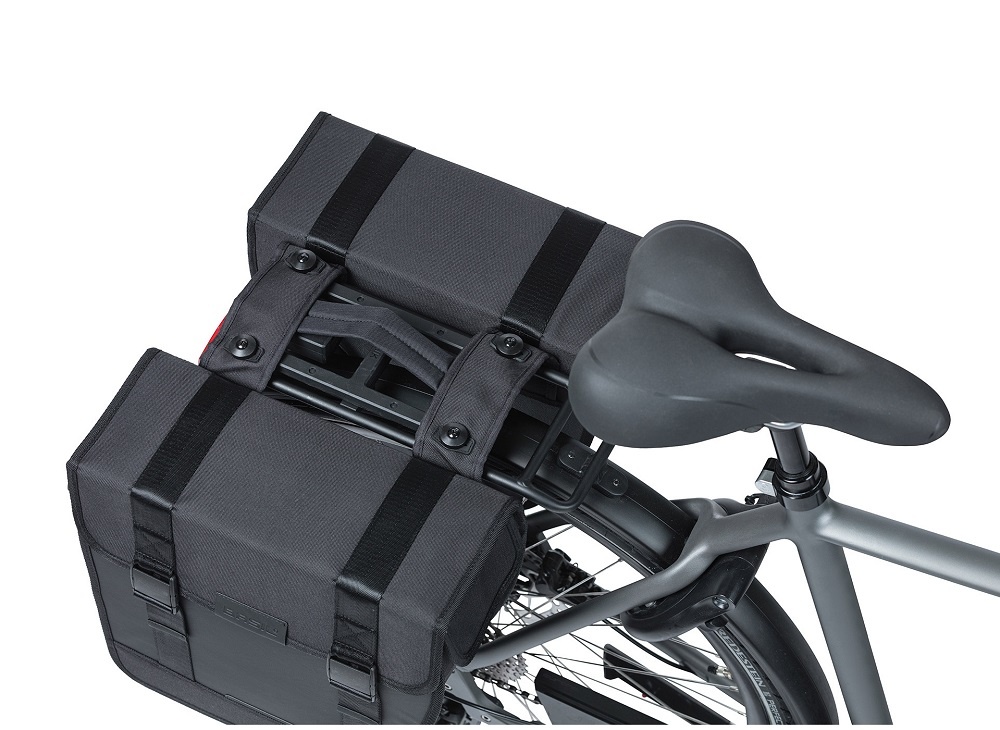 In de Tour-serie van Basil zijn ook enkele fietstassen leverbaar, en dubbele fietstassen met het Universal Bridge-bevestigingssysteem..