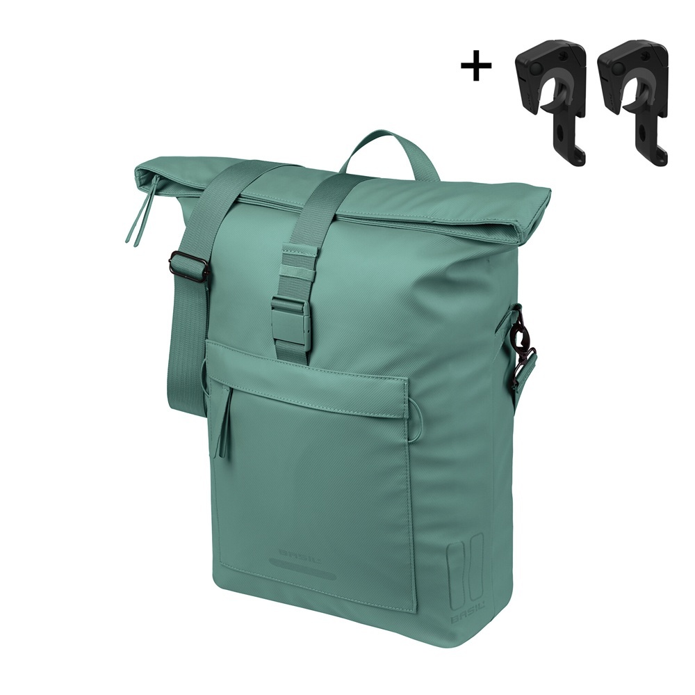 Deze lichtgroene enkele fietstas en schoudertas Brooklyn van Basil heeft een moderne, strakke uitstraling. De tas heeft een inhoud van ca. 17 liter, een waterbestendige vouwsluiting, een laptopvak en een afneembare schouderband. De tas wordt bevestigd met het gebruiksvriendelijke MIK Hooks-systeem. Een ideale fietstas voor in de stad en voor woon-werkverkeer!