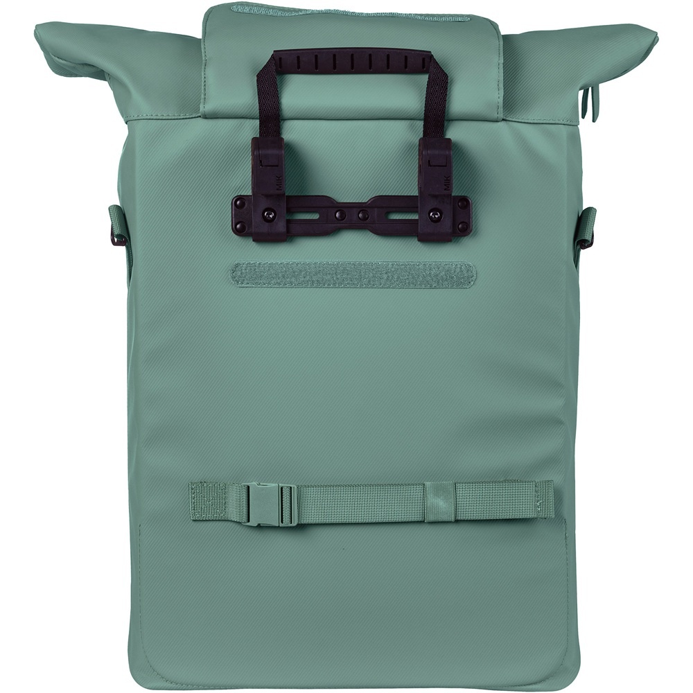 De fietstas is gemakkelijk aan de drager te bevestigen met de klemhaken van het MIK Hooks-systeem. De MIK Hooks zijn geschikt voor bagagedragers met buizen van 9–15 mm of 17–21 mm. Er worden inzetstukken meegeleverd om de haken passend te maken. Een verstelbare band onderaan zorgt voor extra stabiliteit aan de fiets. Om de tas weer van de drager te pakken, hoeft u alleen maar even aan het handvat te trekken dat aan de haken gekoppeld is. De haken klikken vervolgens soepel los. Van de fiets af draagt u de tas gemakkelijk met u mee aan de bijgeleverde afneembare en verstelbare schouderband. De haken zijn keurig netjes weg te werken achter een flap met klittenband.