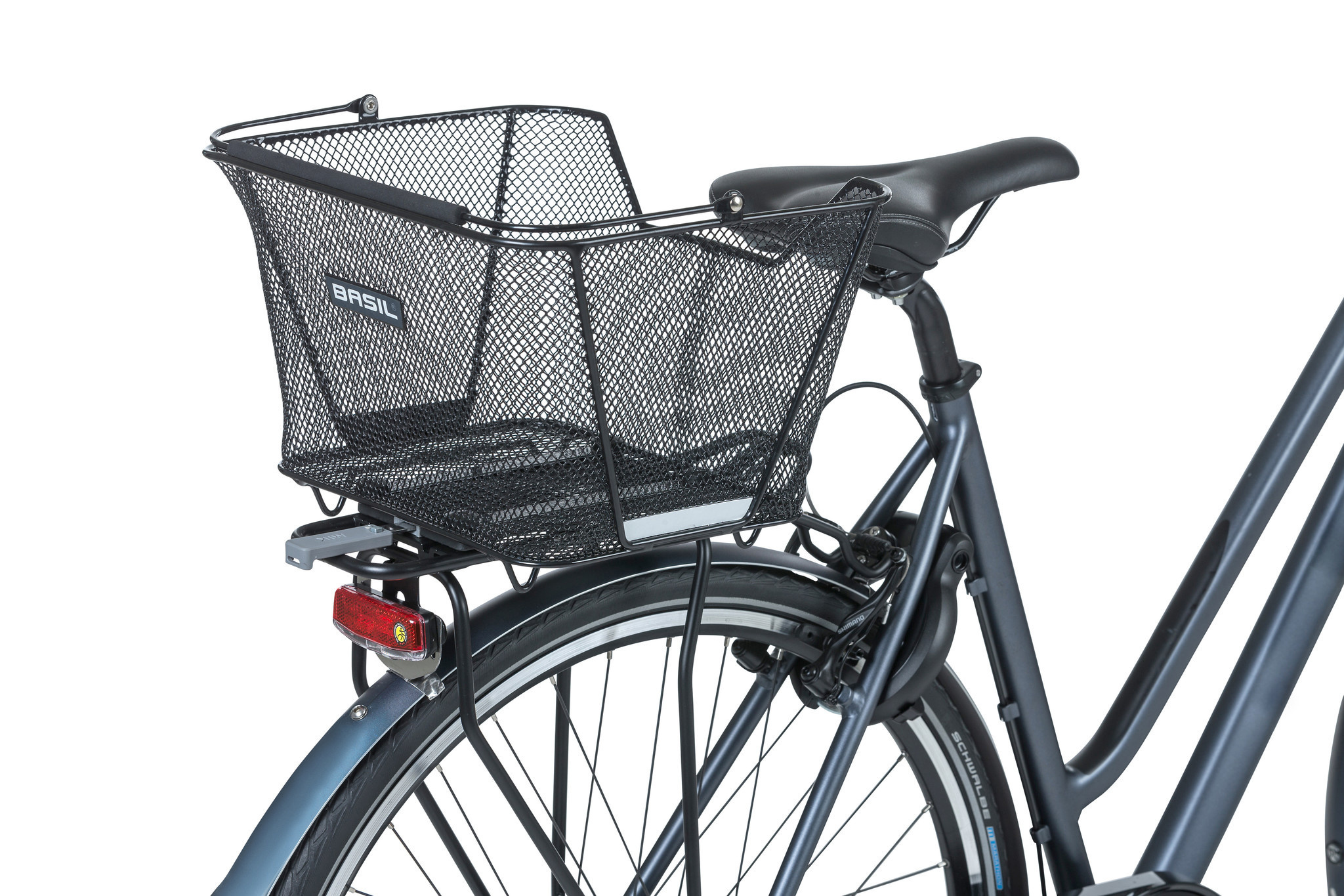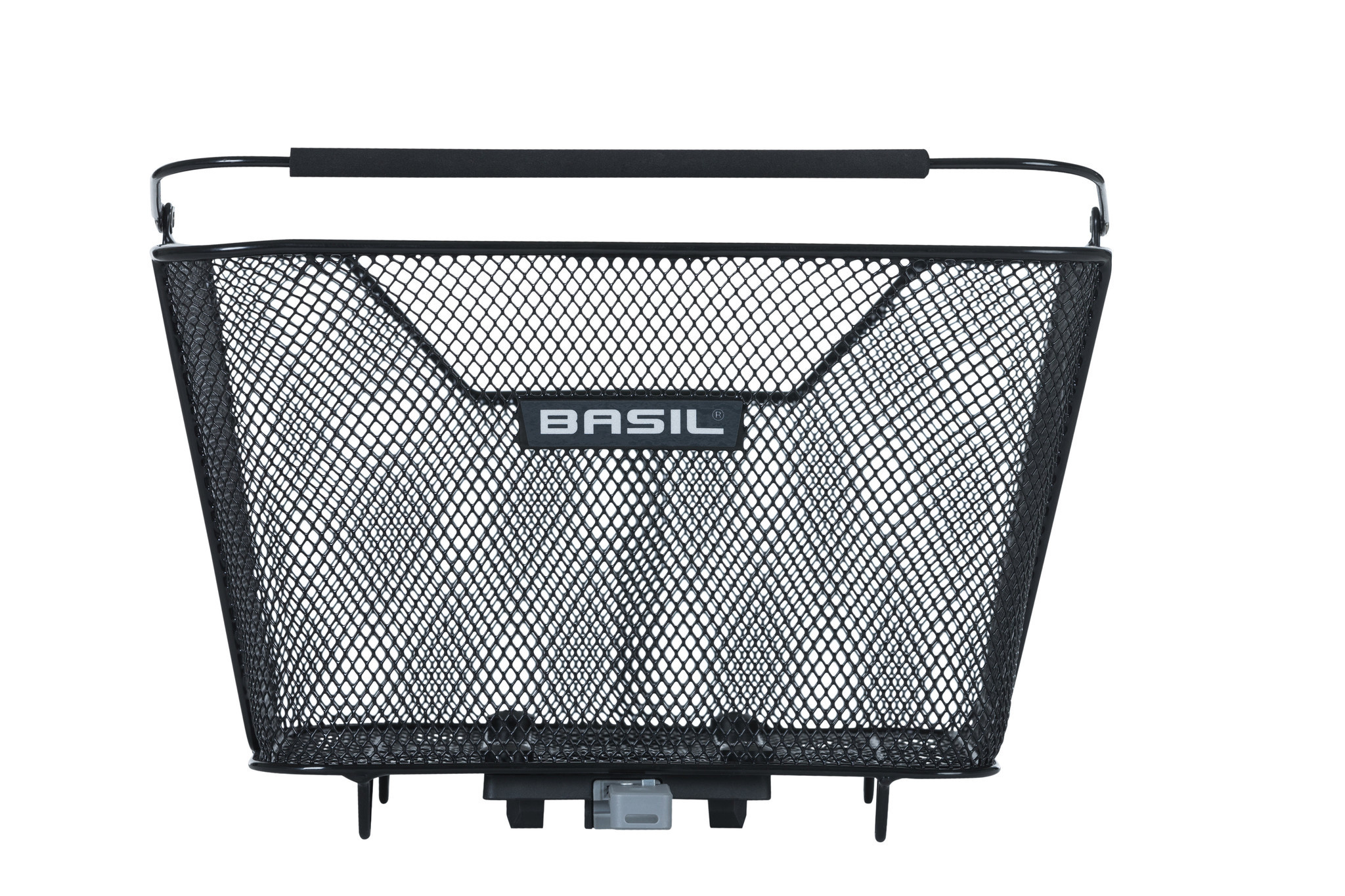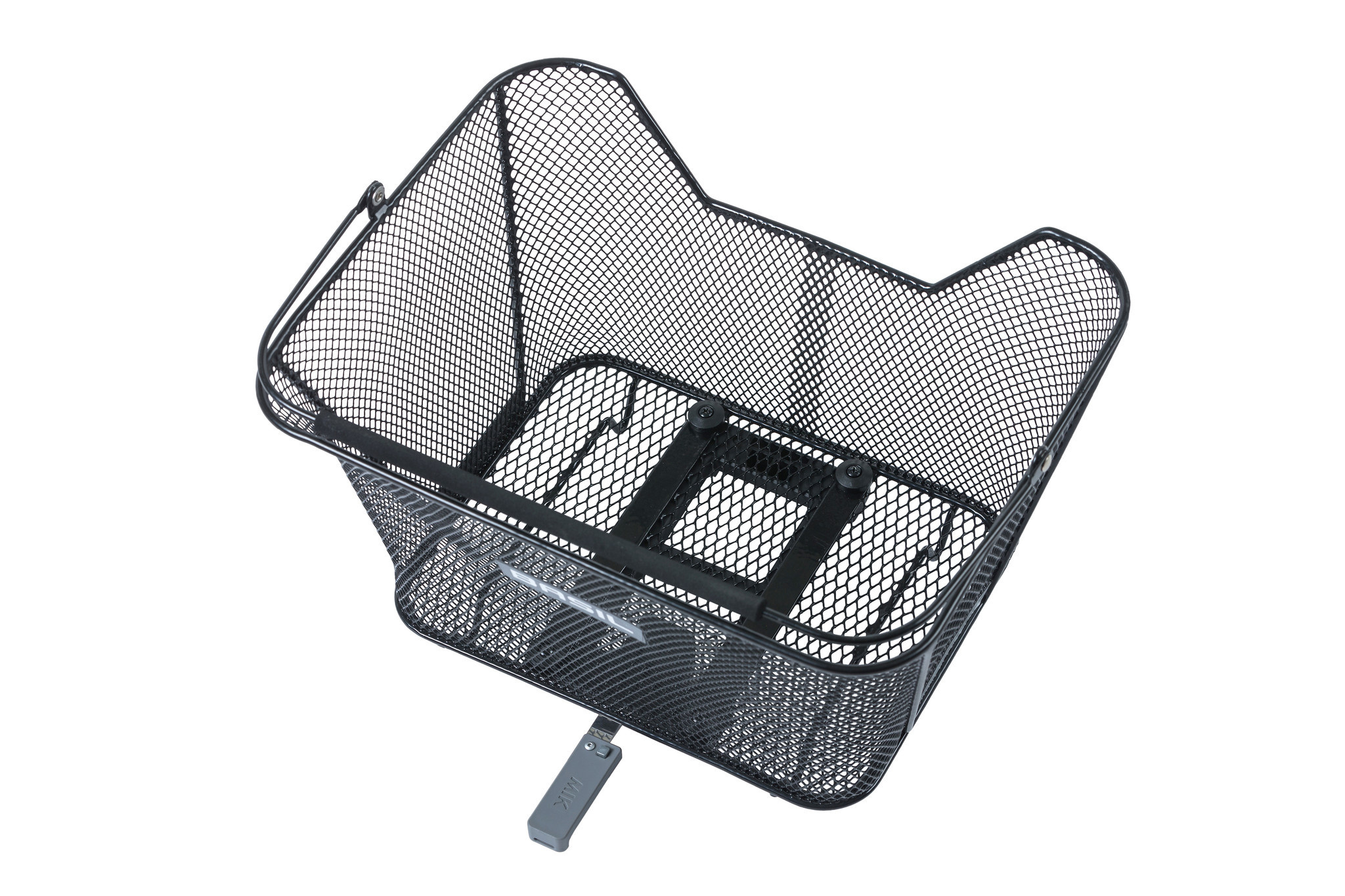Een fraaie, zwarte mand van fijnmazig staal voor achterop de fiets. Deze afneembare fietsmand heeft een handig hengsel met kunststof grip, reflectie en een voorgemonteerde MIK 2.0-adapterplaat.