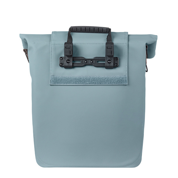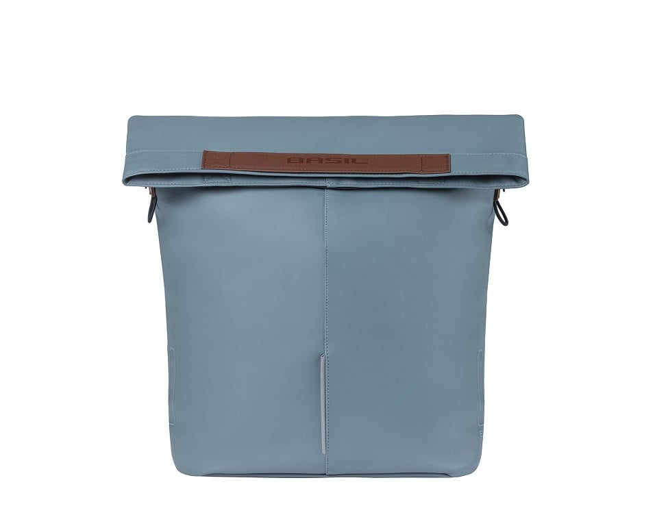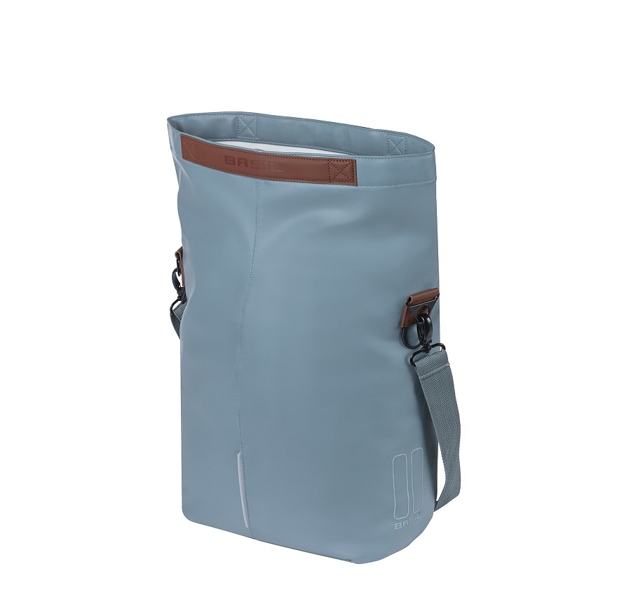 Deze blauwgrijze enkele fietstas en schoudertas is zeer praktisch, en nog modieus en elegant ook. De City Shopper heeft bruine vegan leren details, een inhoud van 14 tot 16 liter, een waterbestendige vouwsluiting en MIK Hooks-bevestiging.