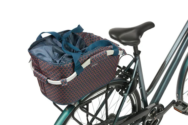 De Flair Carry All Rear Basket van Basil is een trendy, lichtgewicht fietsmand voor achterop de fiets. De afneembare stoffen mand biedt ruimte voor 22 liter aan spullen en is gemaakt van sterk, waterafstotend gerecycled polyester. De Flair is uitgevoerd in marineblauw, met een roodbruine retro print geïnspireerd op de jaren '70.