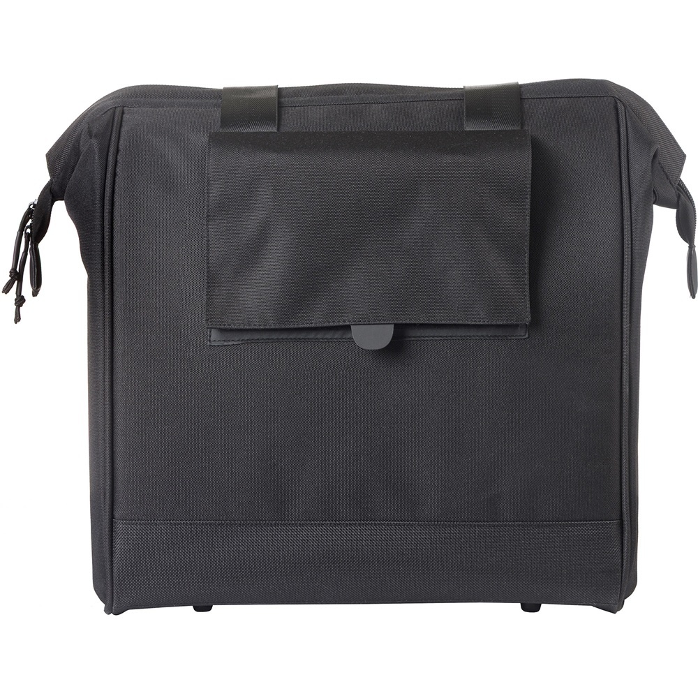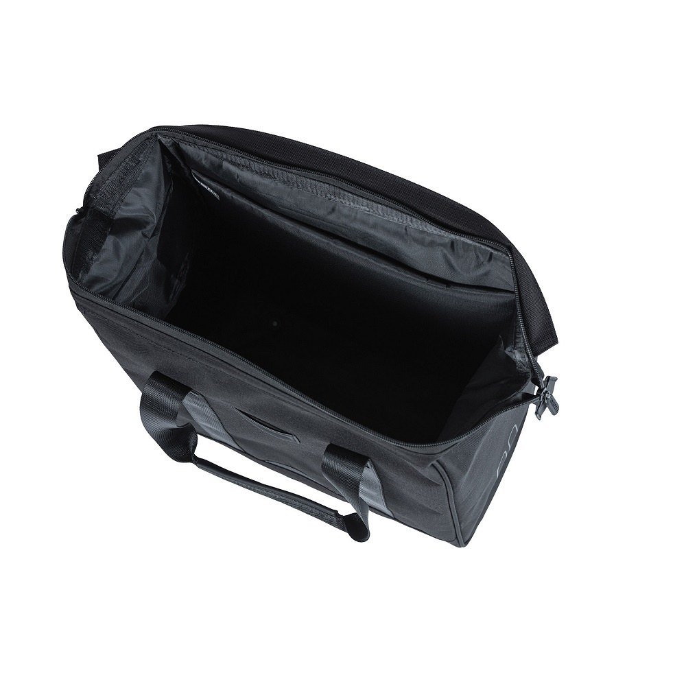In het ruime hoofdvak van de tas zit een gepolsterd laptopvak. De tas sluit met een zogenoemde dokterssluiting en heeft een grote opening. De sluiting heeft een regenwerende afwerking. Dankzij de grootte van de tas kunnen drinkpakken of -flessen rechtop blijven staan in de tas. De handgrepen zijn met een drukknop samen te voegen voor als u de tas los wilt meenemen. Tip: tijdens het fietsen kunt u de handgrepen vastzetten met het lusje aan het logo, zodat ze niet gaan wapperen.