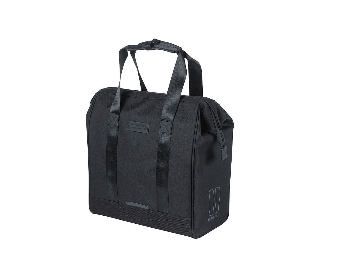 Een stijlvolle, zwarte enkele fietstas: deze Grand Shopper van Basil. De fietstas is gemaakt van waterafstotend polyester en heeft een ruime inhoud van 23 liter. De shopper is uitgerust met een laptopvak, comfortabele handgrepen, ton-sur-ton-reflectie aan drie zijden en het MIK Hooks-bevestigingssysteem.