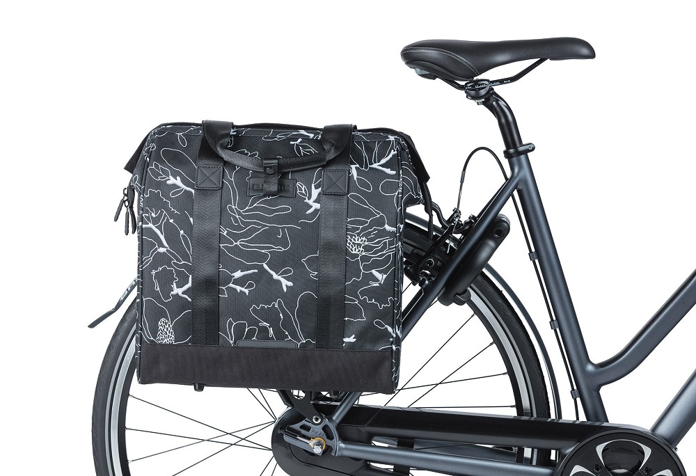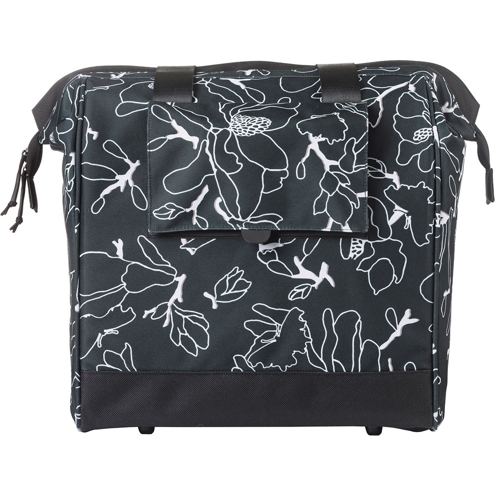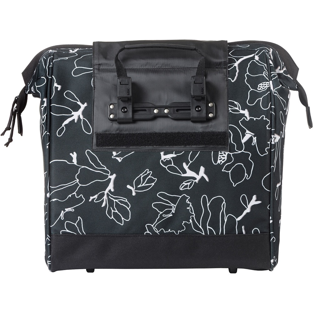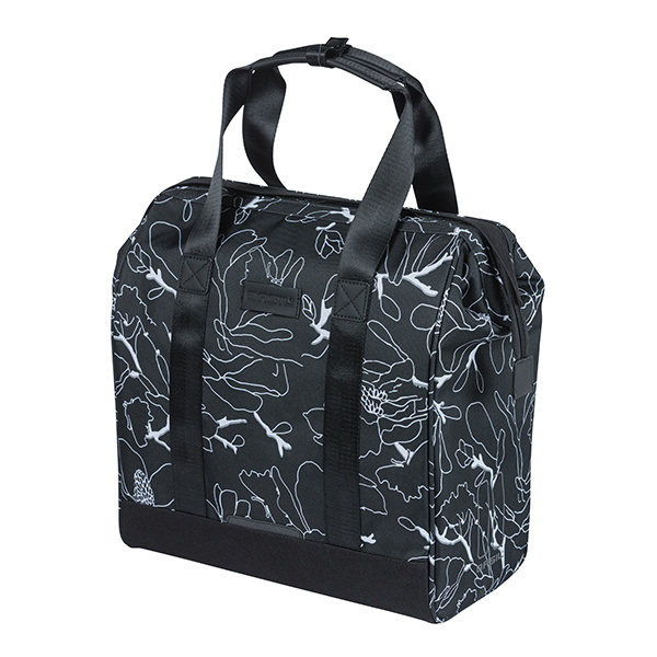 Een stijlvolle enkele fietstas in het zwart met een witte bloemenprint: deze Grand Flower Shopper van Basil. De fietstas is gemaakt van waterafstotend polyester en heeft een ruime inhoud van 23 liter. De shopper is uitgerust met een laptopvak, comfortabele handgrepen, ton-sur-ton-reflectie aan drie zijden en het MIK Hooks-bevestigingssysteem.