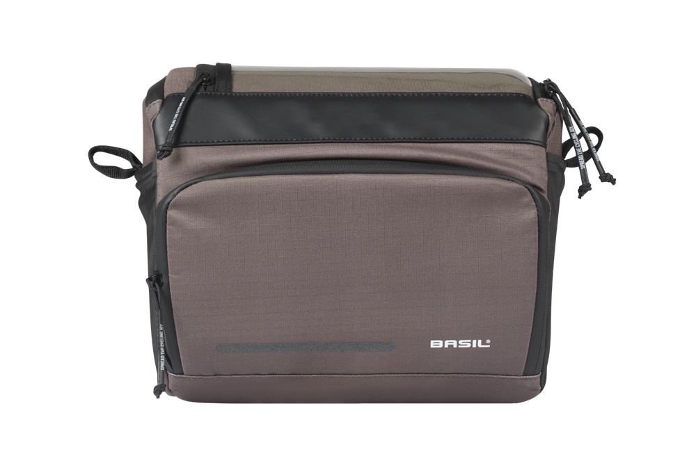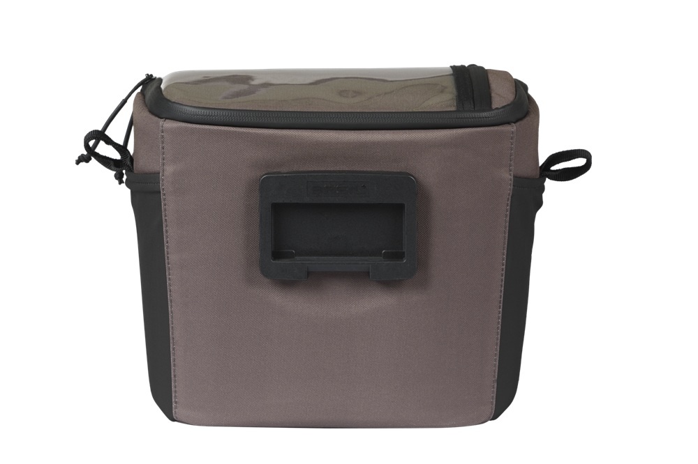 De bruine stuurtas is rondom verstevigd en behoudt daardoor zijn vorm. Bovenop de tas zit een waterdicht transparant venster waarin een smartphone veilig kan worden opgeborgen onderweg. Handig bij het navigeren van een fietsroute per smartphone! Het hoofdvak van de stuurtas sluit met een waterafstotende rits. Binnenin zit een steekvak van mesh, een ritsvak en een sleutelclip. Voorop de tas zit een extra ritsvak, en aan de beide zijkanten bevindt zich een elastisch steekvak.
