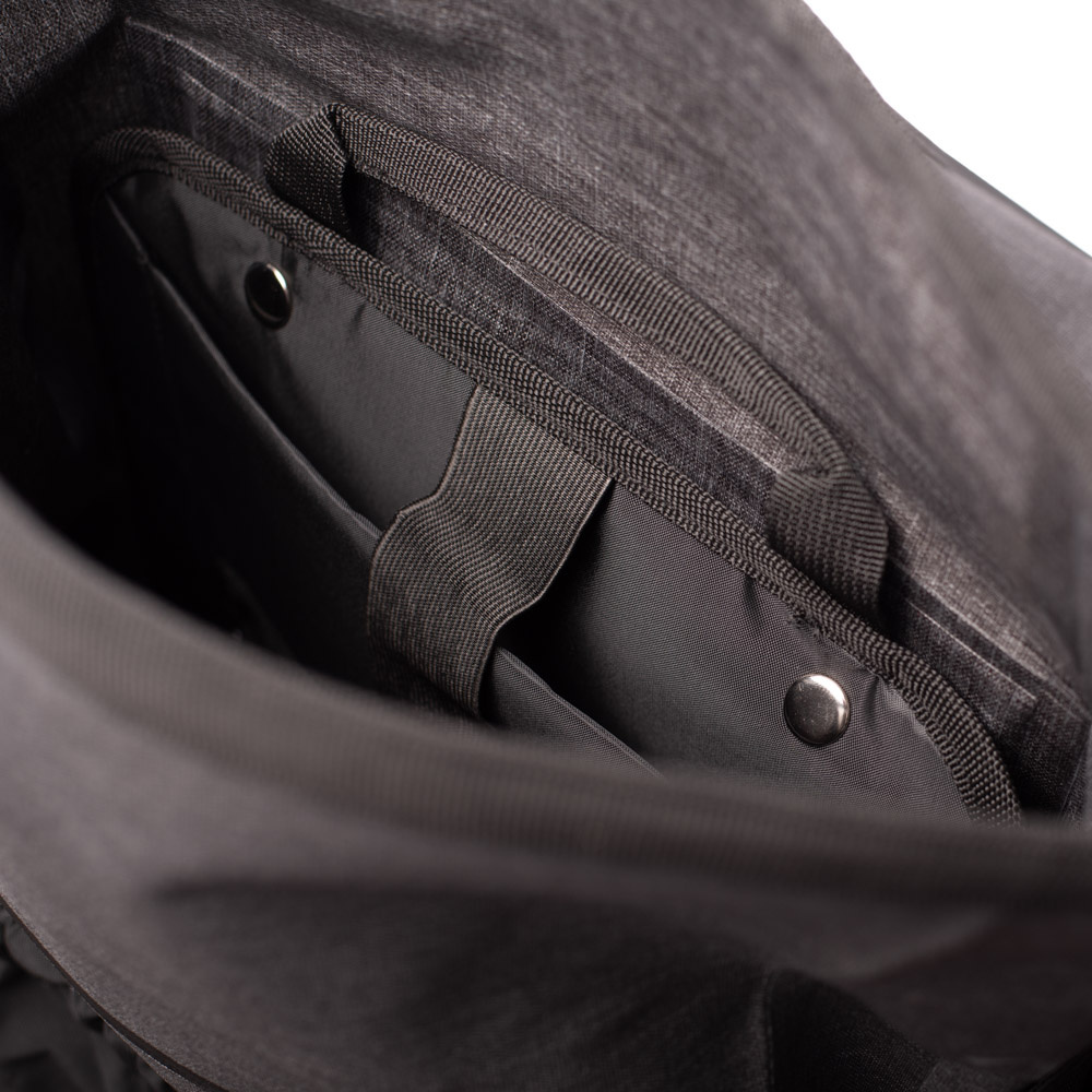 De tas van Beck heeft een ruim hoofdvak dat sluit met een magnetische rolsluiting die u vastzet met een klikgesp. De rolsluiting is hoger of lager af te sluiten, waardoor het volume van de tas kan variëren van 15 tot 20 liter inhoud. Achterin het hoofdvak zit een uitneembare organiser met een verstevigd laptopcompartiment en een ritsvak van gaas. De organiser is in de tas te bevestigen met drukknopen. De tas heeft een verharde achterplaat.