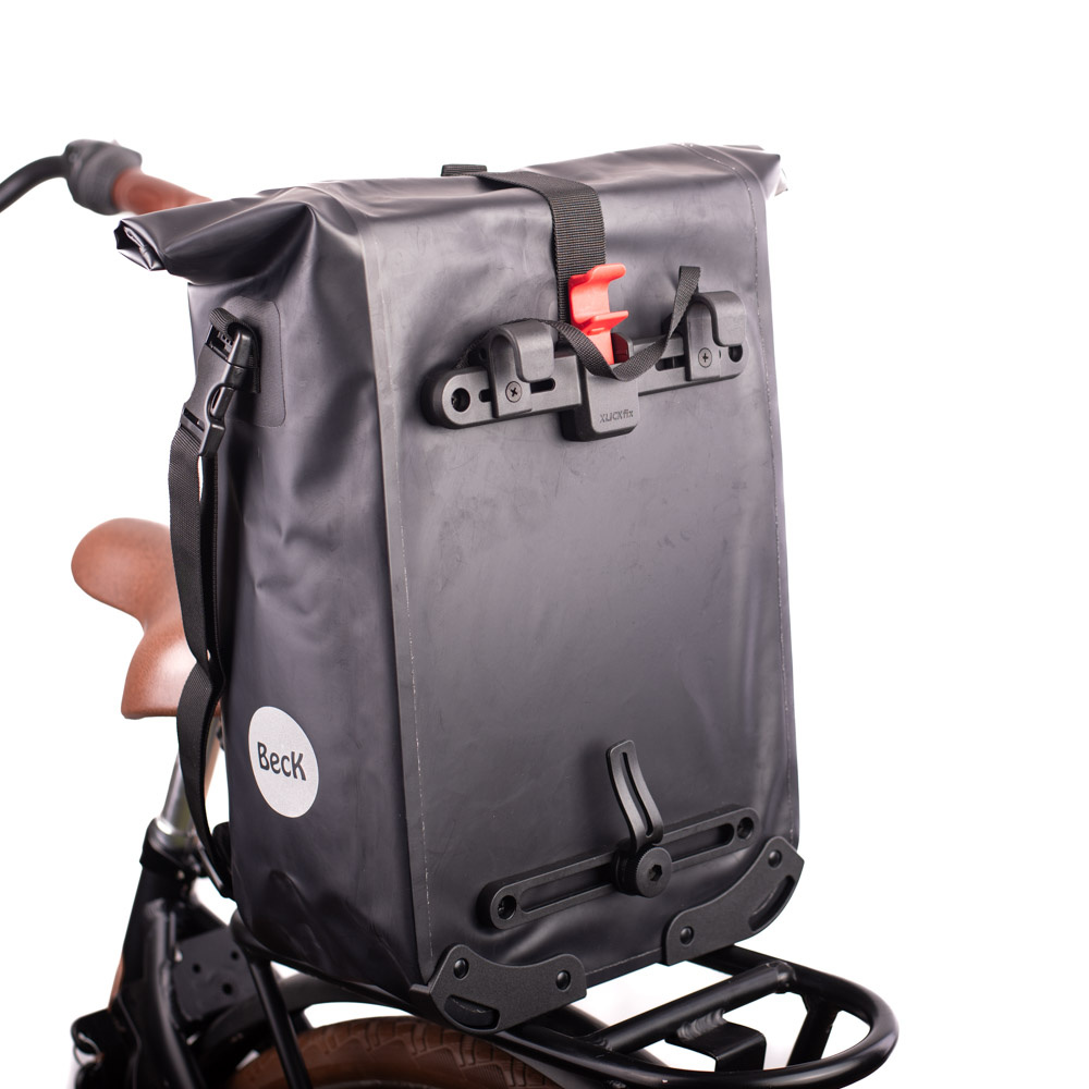 Deze enkele fietstas is eenvoudig aan de bagagedrager vast te maken met ronde KLICKfix-klemhaken. Deze haken zijn horizontaal te verplaatsen. Een draaibare klemhaak onderaan op de achterplaat zorgt ervoor dat de tas netjes op zijn plek blijft. De fietstas is ook geschikt voor gebruik op een e-bike. Wanneer u te voet verder gaat, draagt u de tas gemakkelijk met u mee aan de bijgeleverde verstelbare schouderband. Deze bevestigt u met klikgespen aan de tas.
