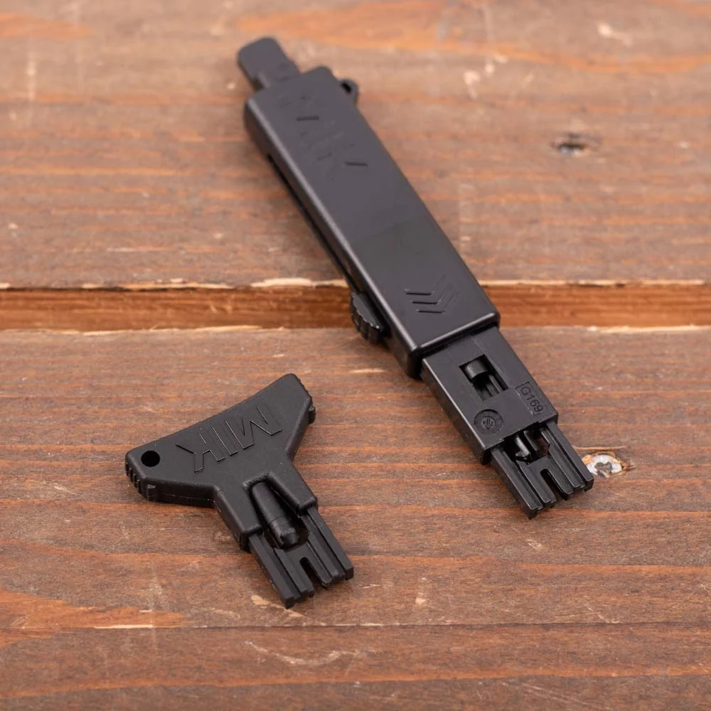 De wat grotere MIK Key L is uitschuifbaar. Dat verschaft extra lengte. Hierdoor is de MIK L sleutel vooral geschikt voor de grotere MIK-accessoires zoals een krat of mand die langer op de fiets vast mogen (of moeten) zitten.