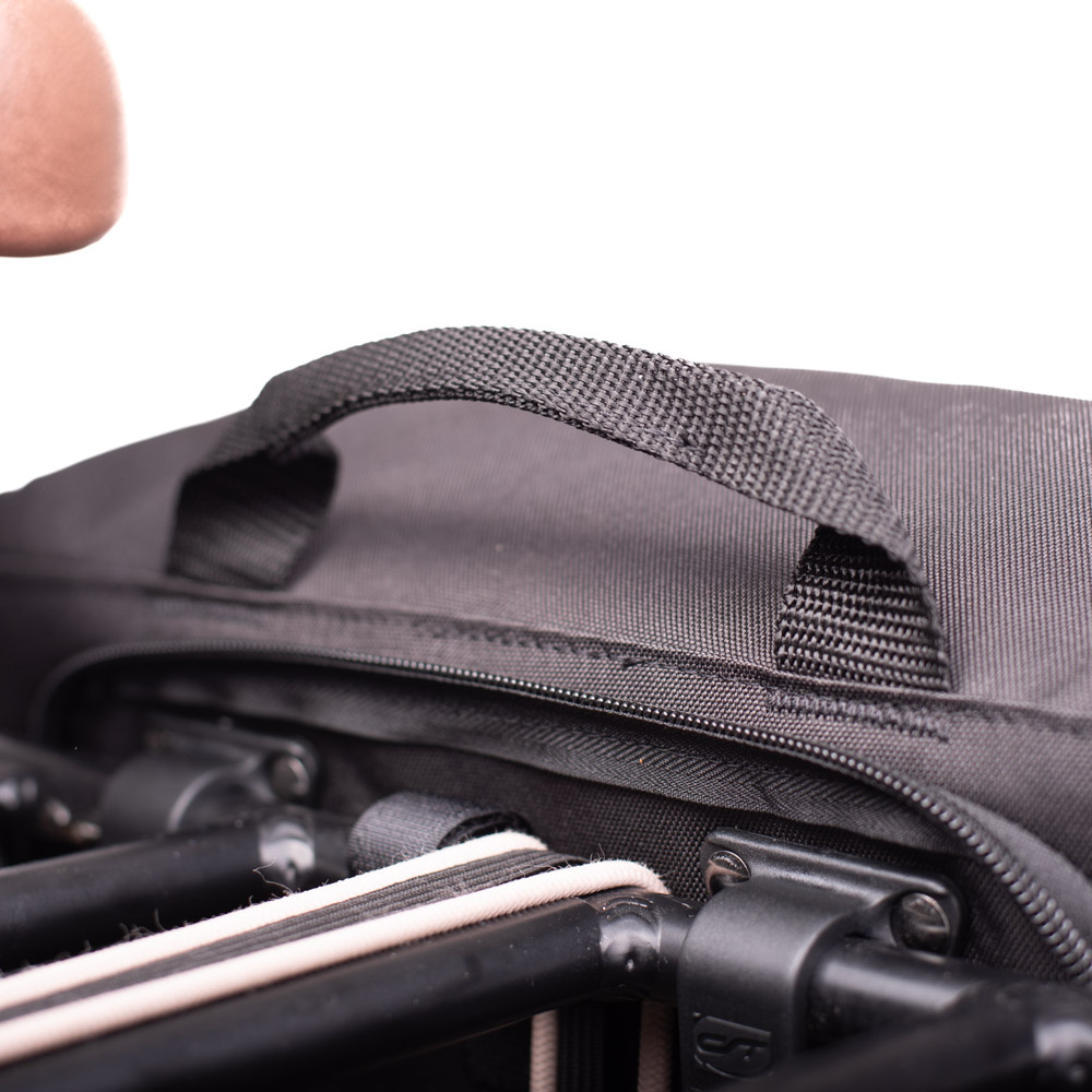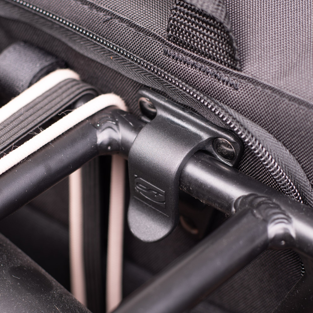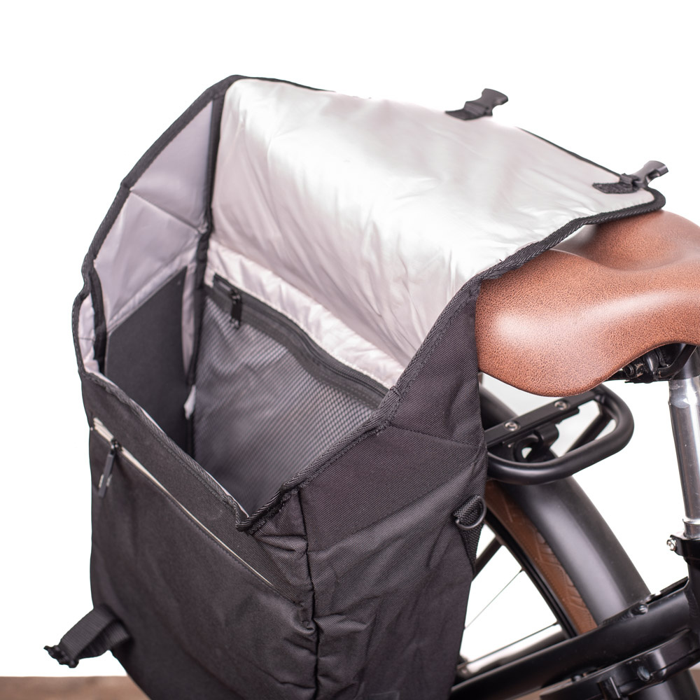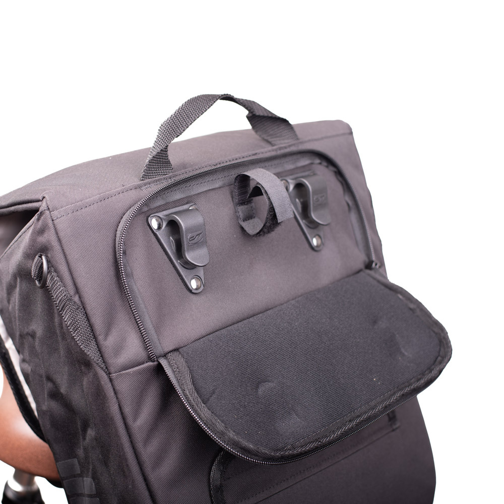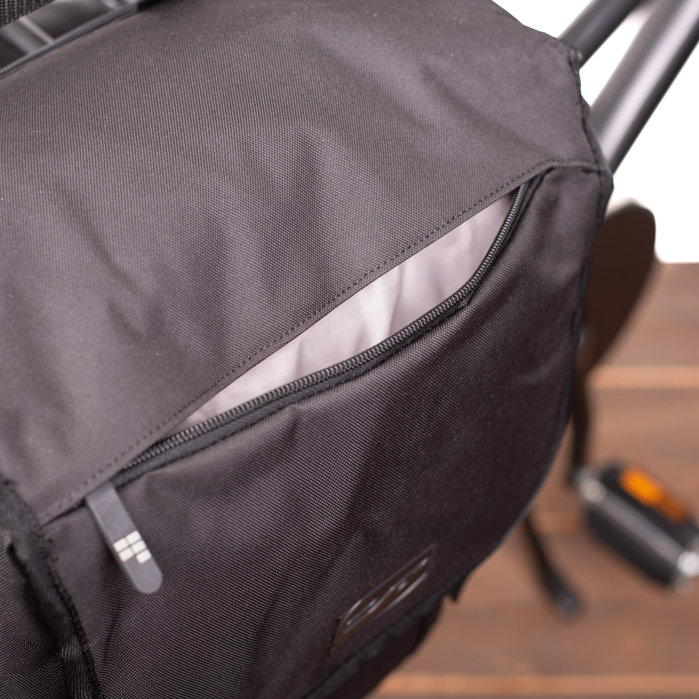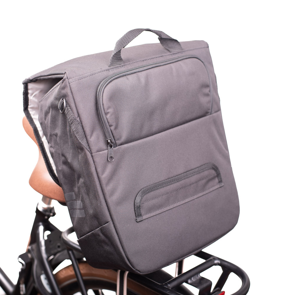 U bevestigt de tas heel eenvoudig met de bevestigingshaken aan de drager van uw fiets, en de tas is net zo makkelijk weer van de drager af te halen. Wanneer u de haken niet gebruikt, bijvoorbeeld wanneer u de tas als schoudertas of pakaftas meeneemt, kunnen deze netjes worden weggewerkt achter een ritsvak.