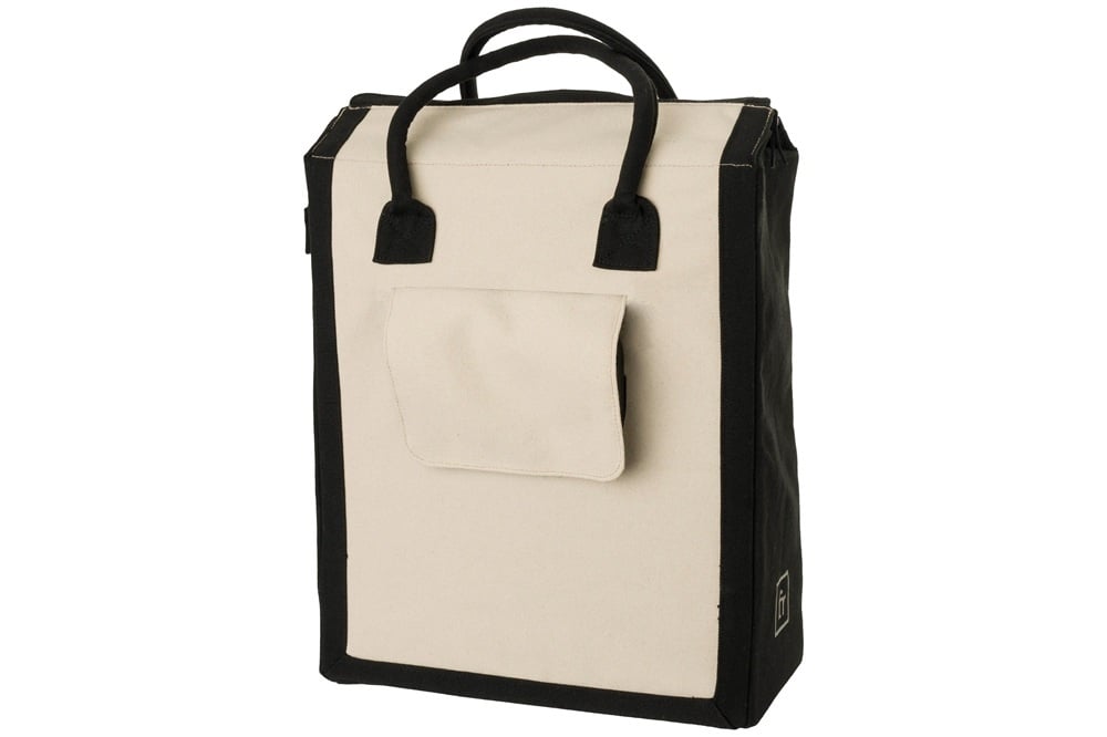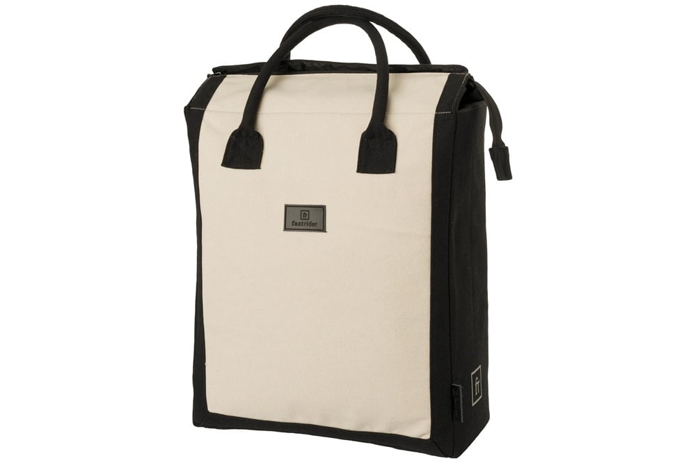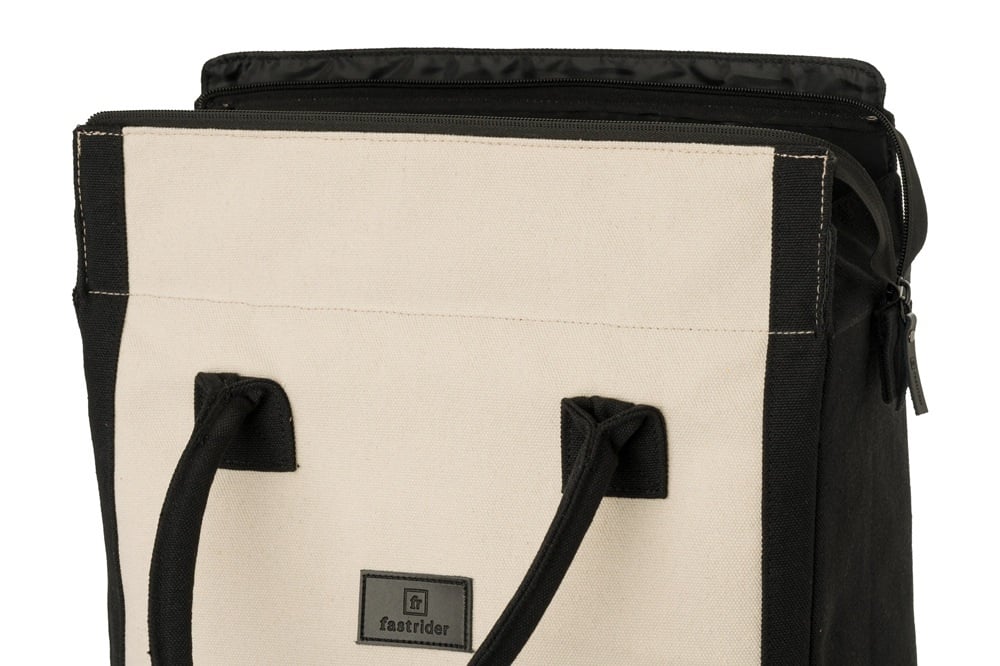 Deze Canvas Classic Shopper van FastRider heeft een tijdloze uitstraling. De enkele fietstas is stevig, heeft een inhoud van ruim 19 liter, is waterafstotend en voorzien van reflectie. De tas, in de kleuren gebroken wit en zwart, is eenvoudig te bevestigen met Click'nGo-haken. Het is een ideale tas voor dagelijkse boodschappen en stadsritten op de fiets.