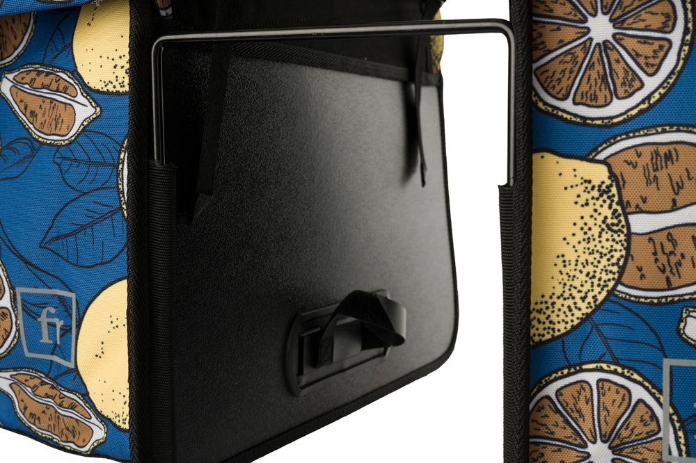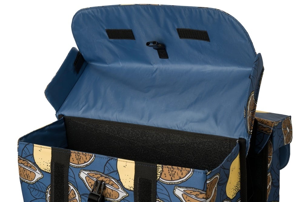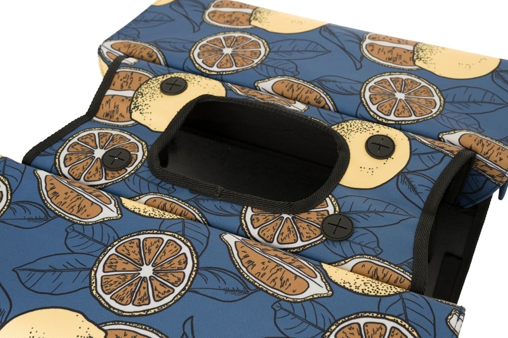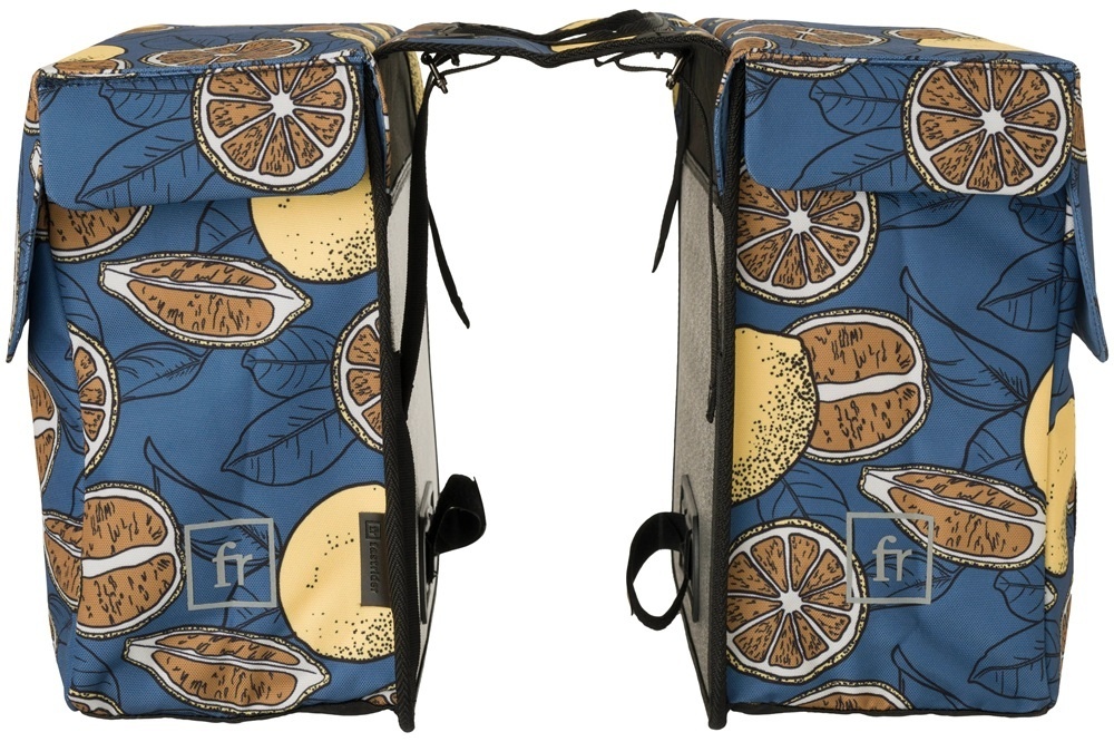 Deze dubbele fietstas Nyla van FastRider heeft een vrolijke print van gele citroenen op een blauwe achtergrond. De tas is waterafstotend, voorzien van reflectie en biedt met 32 liter veel opbergruimte. De Nyla is eenvoudig te bevestigen en is ook geschikt voor het MIK-systeem.