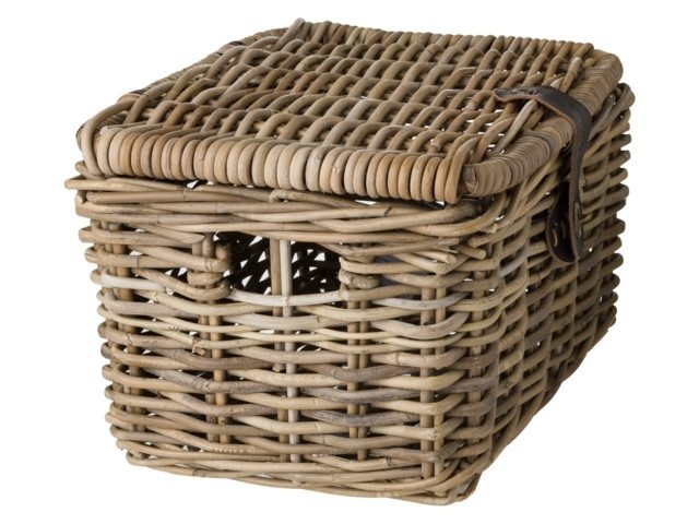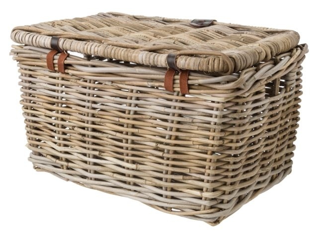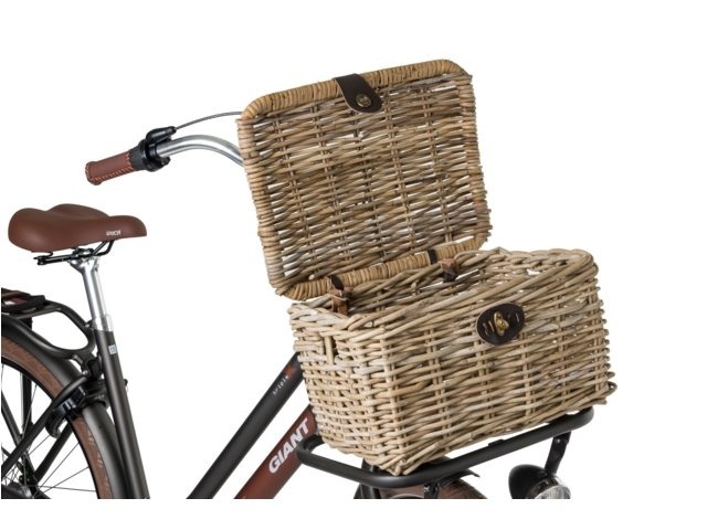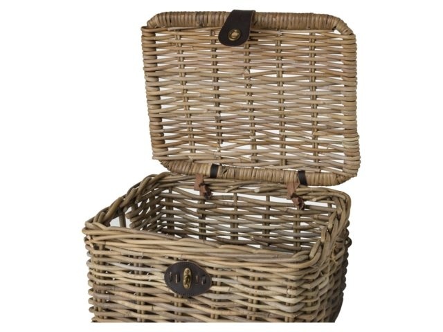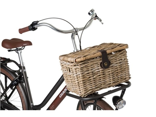 De mand is gemaakt van riet en heeft mooie details, zoals een donkerbruine sluiting in lederlook om de klep vast te zetten. Dankzij de deksel kunt u al uw spullen veilig en beschermd tegen vuil vervoeren. De inhoud van de kratmand in maat L is ca. 17 liter. U bevestigt de mand op de voordrager van uw fiets met de meegeleverde tiewraps.