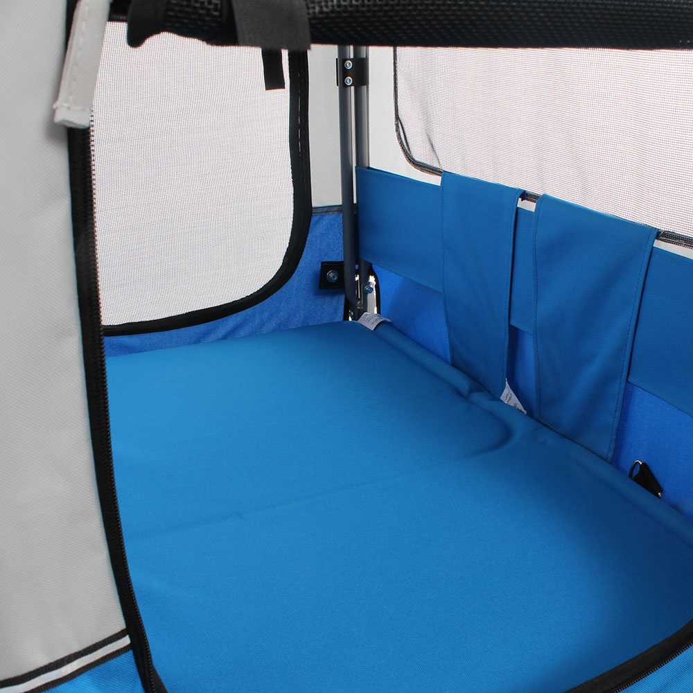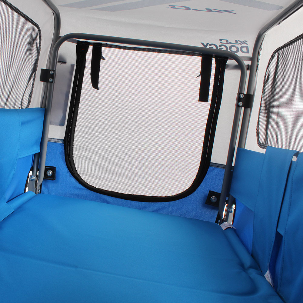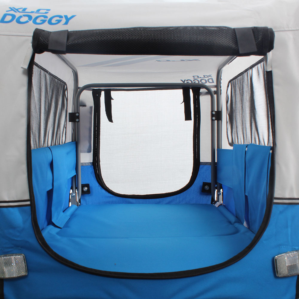 Aan zuurstof geen tekort in deze hondenkar! De voorkant, zijkanten en achterkant zijn voorzien van mesh, een stof met kleine gaatjes. Hierdoor komt er continu frisse lucht de kar in en kan uw hond ook van het uitzicht genieten. Aan de voor- en achterkant van de kar zitten openingen met rits. De flappen van deze openingen zijn oprolbaar en vast te maken met klittenband.