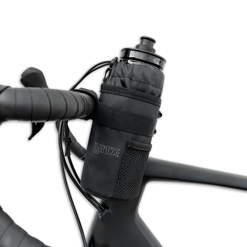Deze zwarte, lichtgewicht flessenhouder stuurtas van het betaalbare merk Lynx is onderdeel van de Wildtrack-serie en speciaal ontwikkeld voor bikepackingtochten met een mountainbike, gravelbike of racefiets.