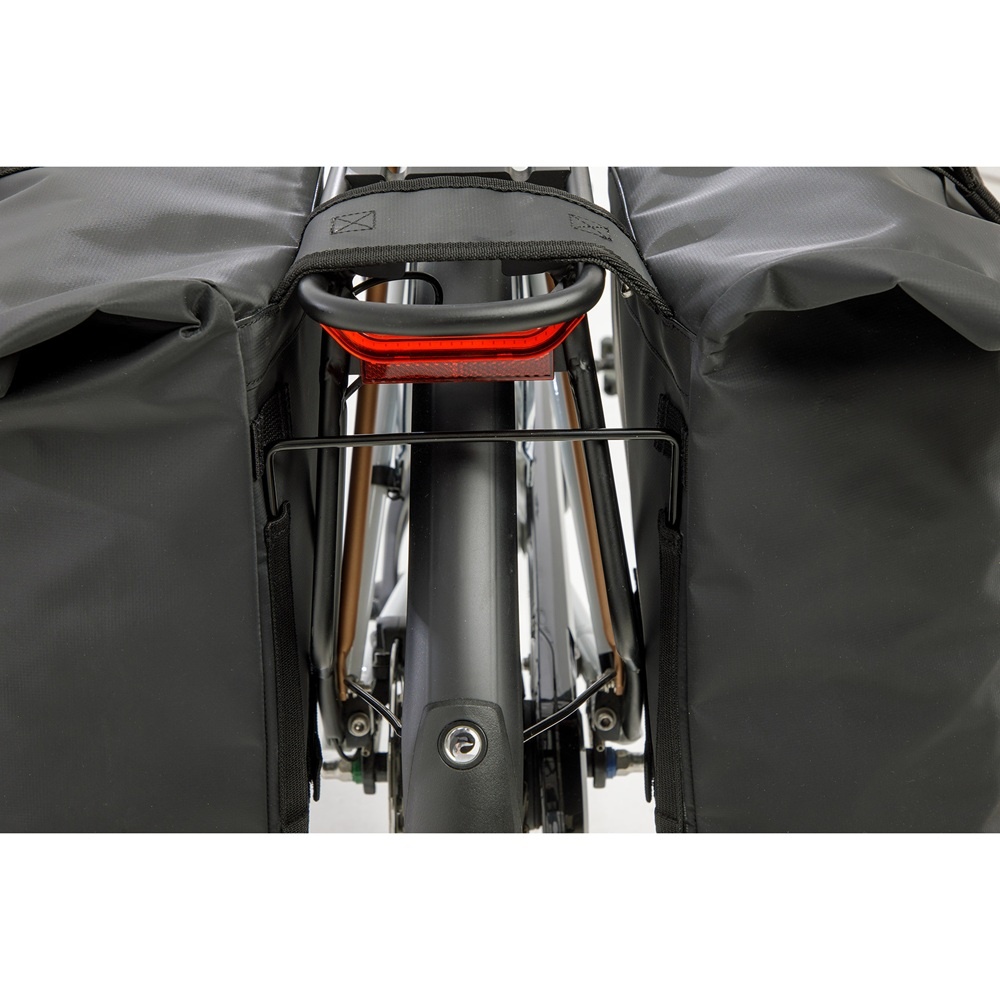 De tas is gemaakt van waterafstotend bisonyl en heeft een waterproof vouwsluiting, waardoor deze bestand is tegen een kleine regenbui. Door de gestikte naden is de tas echter niet 100% waterdicht. Om de tas volledig waterdicht te maken, kunt u de New Looxs-regenhoes voor dubbele fietstassen erbij bestellen.