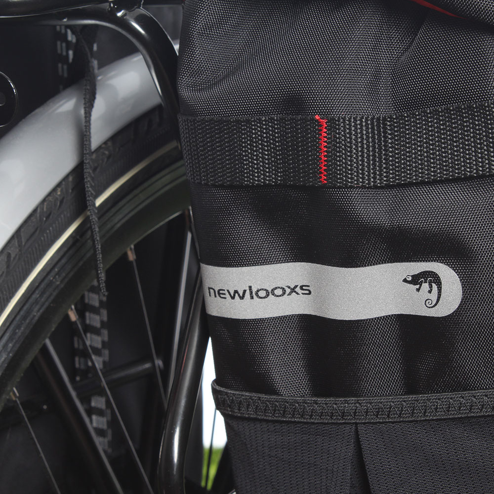 Deze dubbele fietstas heeft ruime hoofdvakken welke u op twee manieren kunt afsluiten. Ten eerste sluit u de tas met een koord welke u kunt aansnoeren. Daarna sluit u de tas met de flap die u met een haak op verschillende standen kunt vast zetten. De tassen zijn voorzien van een verharde bodemplaat en hebben beide een extra voorvak en twee extra zijvakken. De tas is gemaakt van waterafstotend materiaal. Wanneer de tas echt 100% waterdicht moet zijn, kunt u de New Looxs-regenhoes bijbestellen.