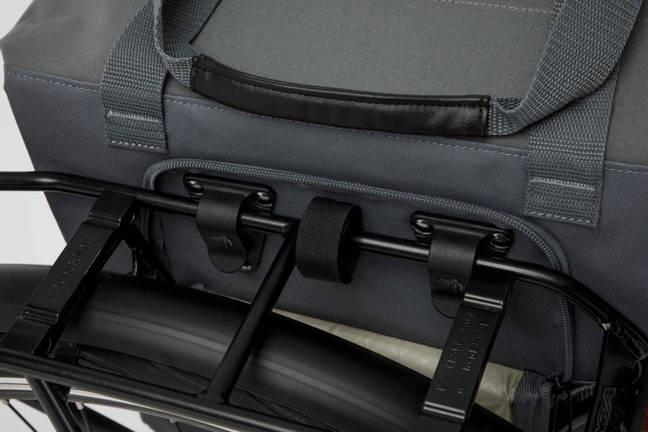De tas is aan de drager van de fiets te bevestigen met kunststof haken, en u haalt 'm er net zo makkelijk weer vanaf. De haken zijn gebogen en niet verstelbaar. Wanneer u te voet verder gaat, kunt u de haken van de tas afdekken achter een flap met een rits. Vervolgens draagt u de tas gemakkelijk met u mee dankzij de twee hengsels. Handig voor het doen van boodschappen! De tas kan ook op een voordrager geplaatst worden. U bevestigt de tas in dat geval met het klittenband aan de achterzijde van de tas.