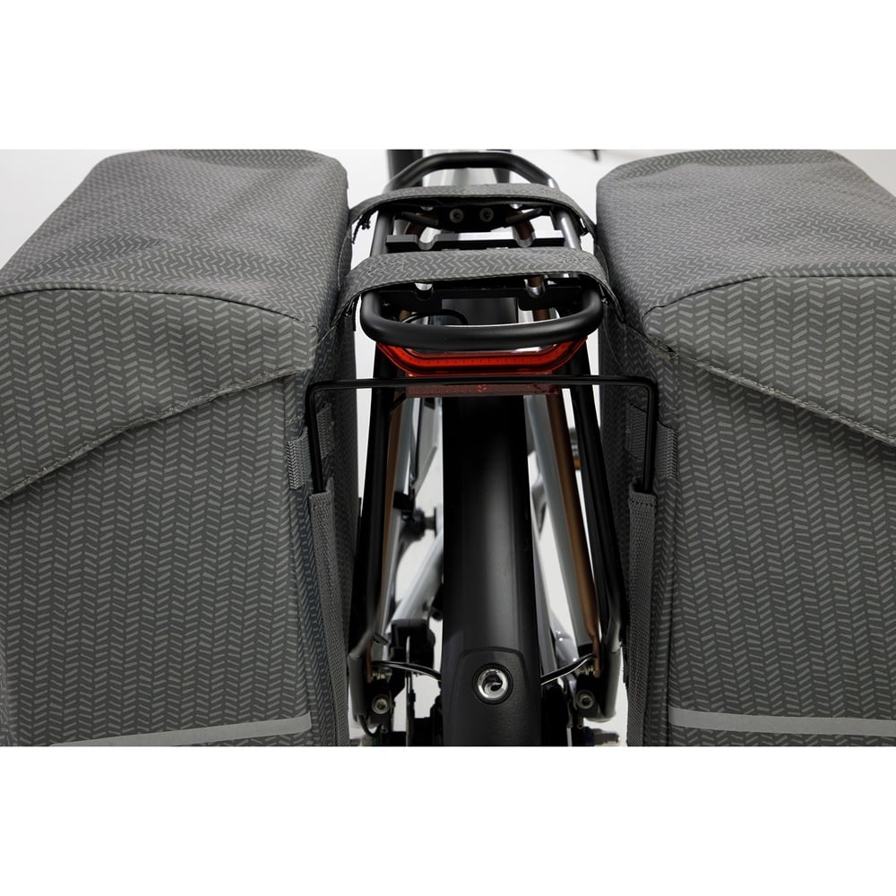 De veelzijdige fietstas heeft twee ruime hoofdvakken met een stijlvolle lichte voering. De klep sluit met twee klikgespen. Aan één kant van de dubbele tas zit onder de afgeronde voorflap een vak met een ritssluiting. Ook in het hoofdvak zit een extra ritsvak. In de bodem van de tas zit een afwateringsgaatje, en dankzij de kunststof platen voor het verstevigen van de bodem en zijkanten is de tas vormvast. Voor extra veiligheid in het donker is de tas voorzien van reflectie.
