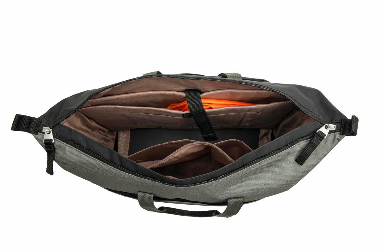 Deze enkele fietstas van waterafstotend polyester heeft een ruim hoofdvak dat u afsluit met een rits. In het hoofdvak bevindt zich een gewatteerd laptopvak geschikt voor een 15" laptop, drie kleinere vakken en een groot binnenvak met een ritssluiting. Voorop de tas zit nog een ritsvak. De meegeleverde losse bodemplaat zorgt ervoor dat de tas zijn vorm behoudt. Een oranje regenhoes met reflectie is ook inbegrepen.