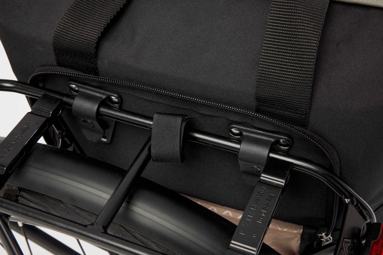 U bevestigt de fietstas met twee kunststof New Looxs-haken en klittenband aan uw bagagedrager. Het voordeel van deze haken is dat u de tas snel op de fiets zet en hem er net zo makkelijk weer vanaf haalt. De haken zijn gebogen en niet verstelbaar. Wanneer u te voet verder gaat, kunt u de haken van de tas afdekken achter een flap met een rits. Dankzij de brede nylon handvaten draagt de tas comfortabel.