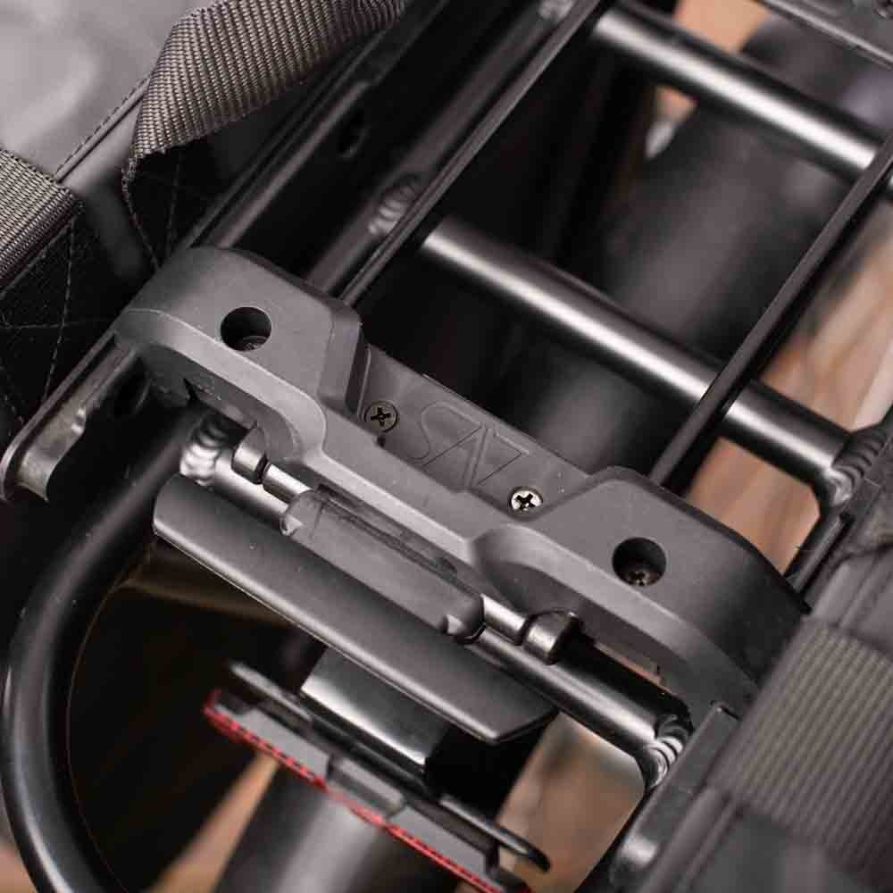 Met het AVS-systeem (Atran Velo) zijn de fietstassen heel gemakkelijk op en van de bagagedrager te klikken. Een losse AVS-adapter wordt meegeleverd. Een draaibare haak aan de onderkant van de achterplaat zorgt voor extra stabiliteit aan de fiets.