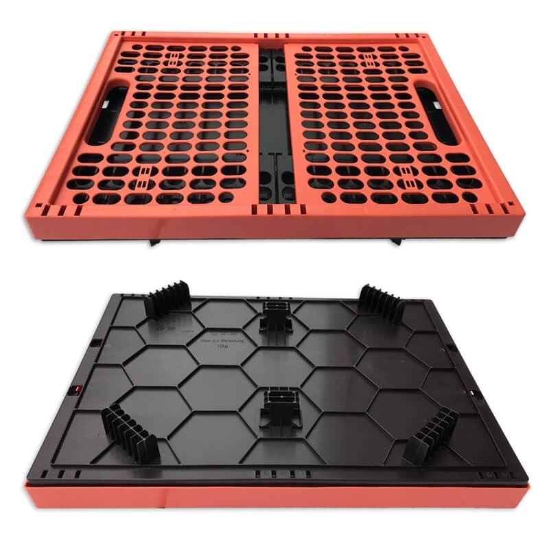 Een mooie fietskrat in koraalrood en zwart van Plates 4 Bikes, met een inhoud van 32 liter. De krat is opvouwbaar, en dankzij het handige Click, Slide & GO-systeem, ook afneembaar. Door het formaat van de fietskrat is deze geschikt voor plaatsing op een voor- en achterdrager.