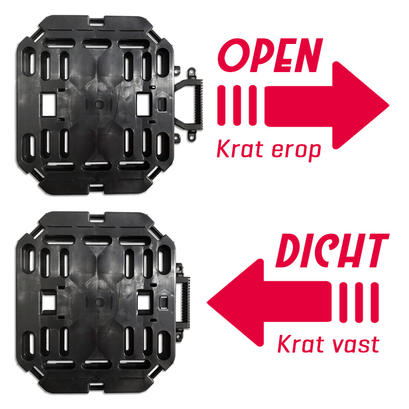 U zet deze vouwkrat met één simpele schuifbeweging vast op de fiets dankzij de multifunctionele plaat met het Click, Slide & GO-systeem. De plaat kan worden bevestigd op vlakke voor- en achterdragers met een breedte van 10,5 – 16,5 cm. De plaat is voorzien van extra bevestigingspunten voor bijvoorbeeld spinbinders, zodat u ook andere spullen kunt vervoeren op de fiets. Deze basisset wordt geleverd met de benodigde bevestigingsmaterialen en gereedschap.