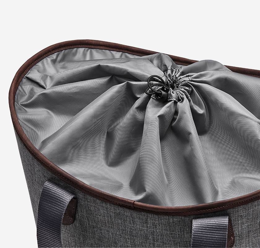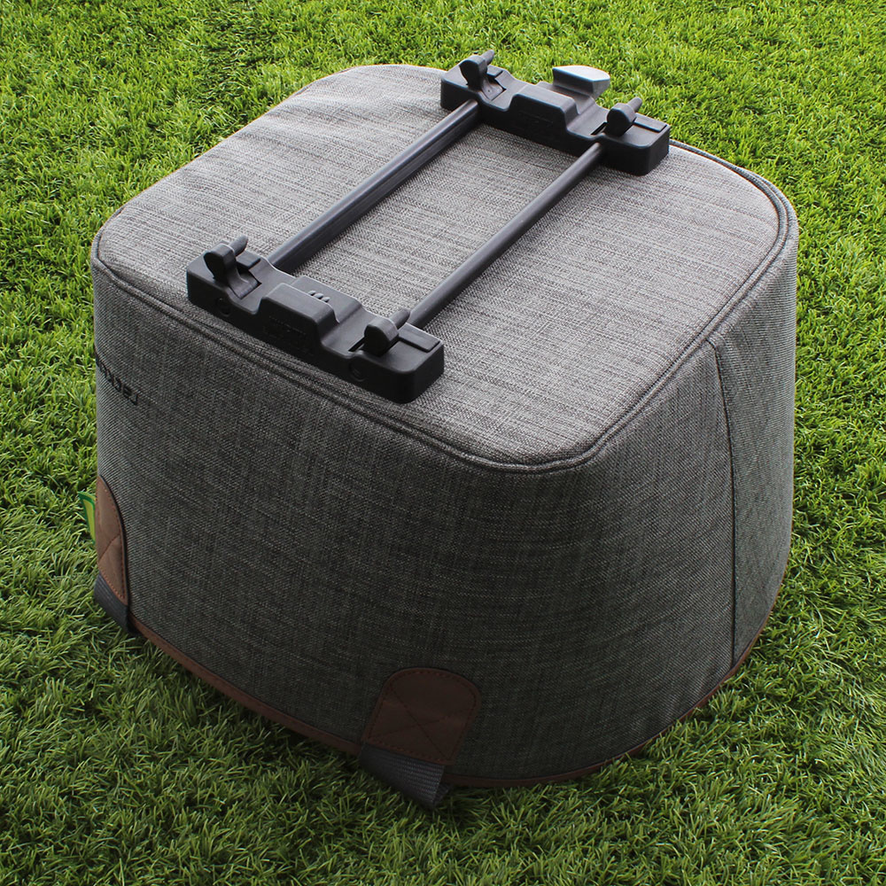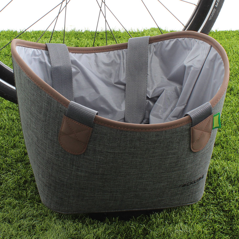 Tot slot nog een extraatje: deze boodschappentas voor op de fiets - goed voor 15 liter inhoud - heeft ook nog een handig binnenzakje, met rits. De binnenvoering met regenhoes is grijs. En de vorm is gebogen met kleine hoogteverschillen voor een modieus effect, maar qua afmetingen neigt de tas naar vierkant vanwege de (ongeveer) even lange zijden.