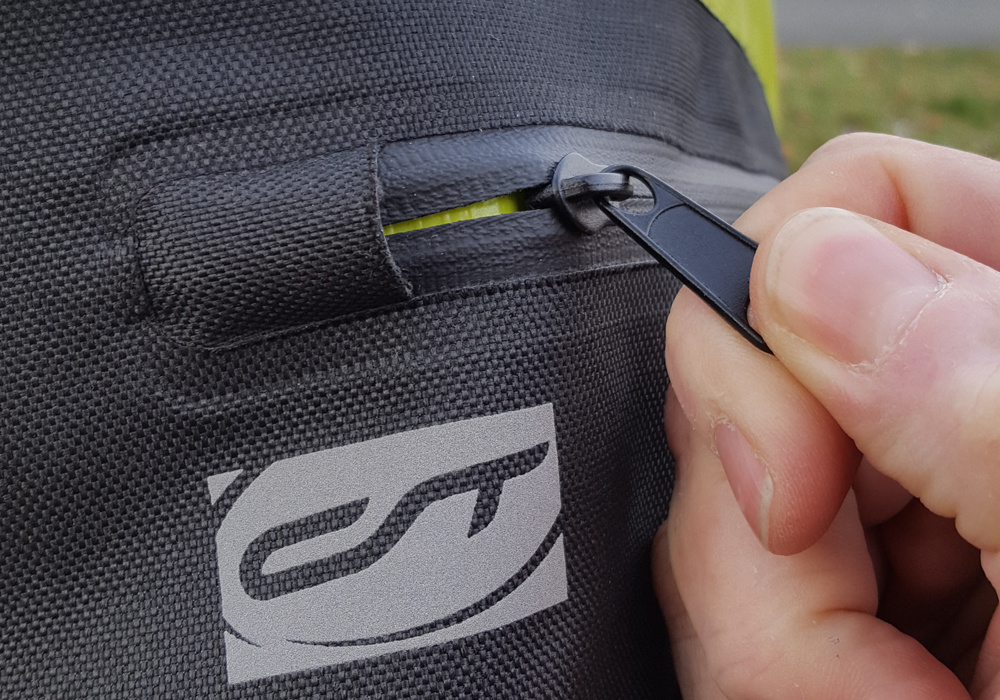 Verder heeft deze pure tas voor op de rug een vast hengsel, een groot stuk klittenband om de rolsluiting (met verharde rand voor meer grip) mee vast te zetten, en reflecterende onderdelen. Het gaas aan de rugzijde is sneldrogend en de schouderriemen zijn afzonderlijk verstelbaar: zowel de borstriem als de heupgordel. En: de tas is licht van gewicht.