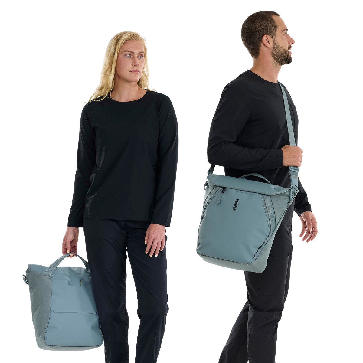 De lichtblauwe Chasm Courier van Thule is een enkele fietstas en stijlvolle messenger bag/koerierstas ineen, met een inhoud van 22 liter. De fietstas is geschikt voor bevestiging aan de bagagedrager met het Thule InLock-systeem. Het is een ideale 'stadse' tas voor woon-werkverkeer en dagelijks gebruik.