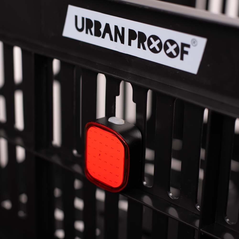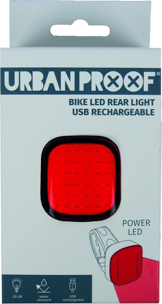 Een vierkant LED-achterlicht van Urban Proof, voor achterop de fiets, te bevestigen aan de zadelpen of de bagagedrager. Het duurzame achterlicht is USB-oplaadbaar en gaat lang mee. Bovendien is het lampje IPX4 waterbestendig. Met dit rode lichtje (20 LM) bent u goed zichtbaar voor andere weggebruikers.