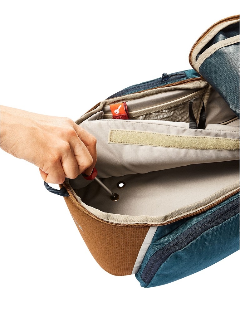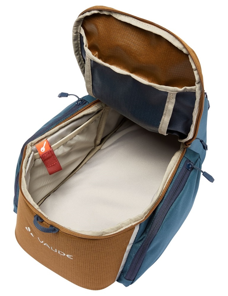 Het hoofdvak van de tas is uitgerust met een mesh steekvak en een sleutelclip. Dit vak sluit met een ritssluiting rondom, zodat de klep opengeklapt kan worden en u overal gemakkelijk bij kunt. Op de beide zijkanten van de tas zit een ritsvak, en onder het elastieken bagagenet bovenop de tas kunt u bijvoorbeeld een regenjack kwijt. De tas is verder uitgerust met een losse oranjerode regenhoes, een afneembare schouderband en reflectie. De schouderband kunt u tijdens het fietsen opbergen in het daarvoor bestemde meshvak op de tas.