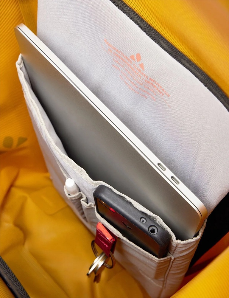 In het ruime hoofdvak zit een overzichtelijke organiser, met een gevoerd smartphonevak, penhouders, een sleutelhouder en een laptopvak. Het gevoerde laptopvak biedt ruimte voor een 13,3 inch notebook of een tablet. Het hoofdvak sluit met een waterproof rolsluiting, die u vastzet met een band met een klikgesp. Op de voorkant van de omkeerbare flap zit een waterdicht ritsvak, waar u bijvoorbeeld uw telefoon en andere spullen die u snel voor het grijpen wilt hebben in op kunt bergen.