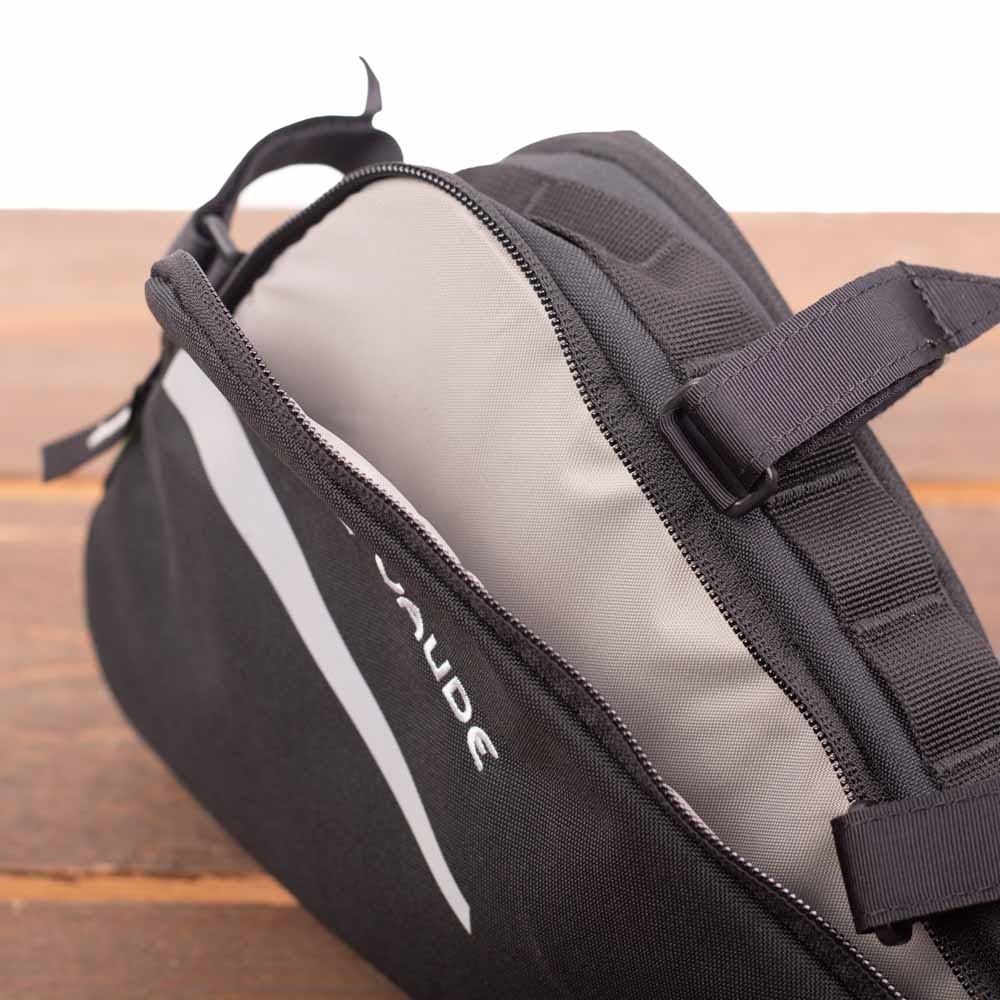 Deze zwarte frametas van Vaude bespaart ruimte door zijn driehoeksvorm. De tas heeft een hoofdvak en buitenvak die ruimte bieden voor bijvoorbeeld klein gereedschap en een minipomp. Beide vakken sluit u af met een rits. De frametas is gemaakt van waterafstotend materiaal en heeft reflecterende details. Met de drie klittenbandsluitingen bevestigt u de tas makkelijk en veilig tussen de bovenstang en zadelpen op uw fiets. Deze veelzijdige klittenbandsluitingen zijn verstelbaar over de lengte van de tas, zodat u de tas keurig passend kunt bevestigen.
