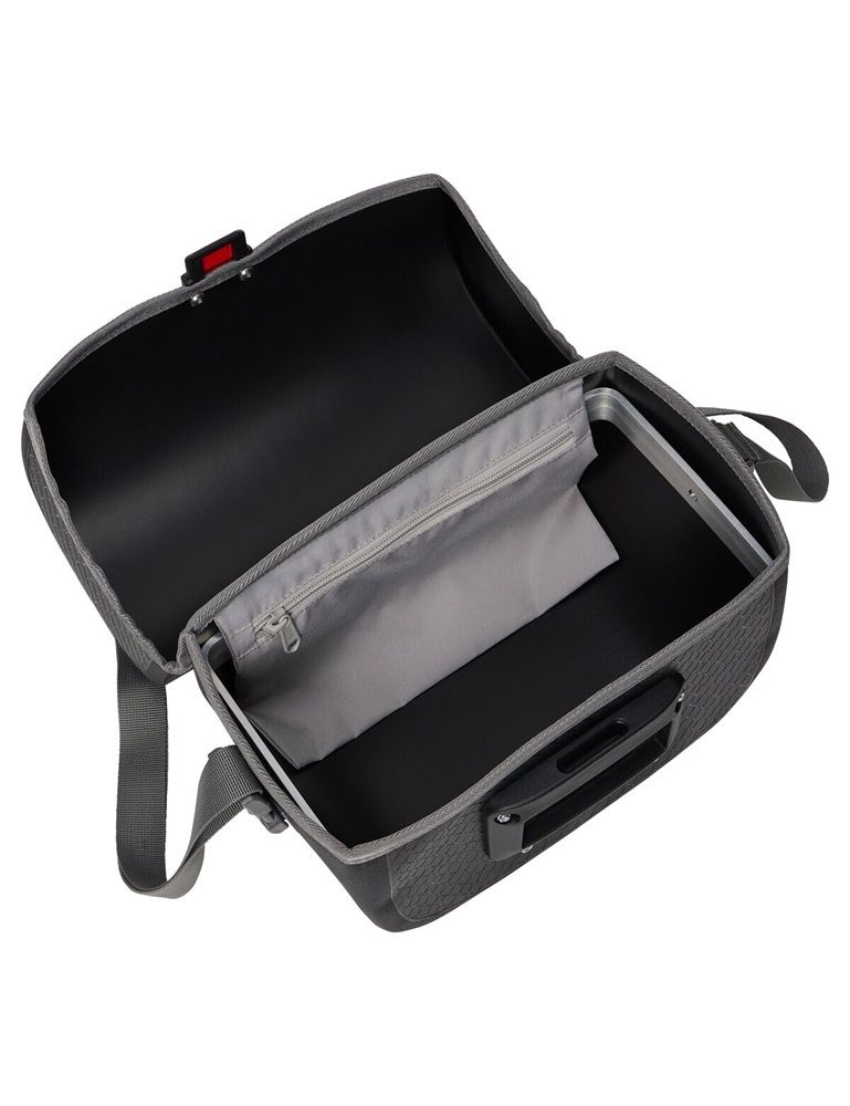 De verstevigde, vormvaste Aqua Box is eenvoudig met één hand te openen. Op de bovenkant van de tas is er ruimte voor een hoestas BeGuided (niet inbegrepen, zie gerelateerde producten). In deze hoestas kunt u een fietskaart, telefoon of tablet plaatsen, zodat u altijd weet welke kant u op moet. Onder het elastische koord op de bovenkant kunt u handschoenen of een windjack opbergen. Binnenin de tas vindt u opbergvak met een rits. En dankzij de bijgeleverde afneembare schouderband kunt u de Aqua Box als schoudertas dragen wanneer u te voet verder gaat.
