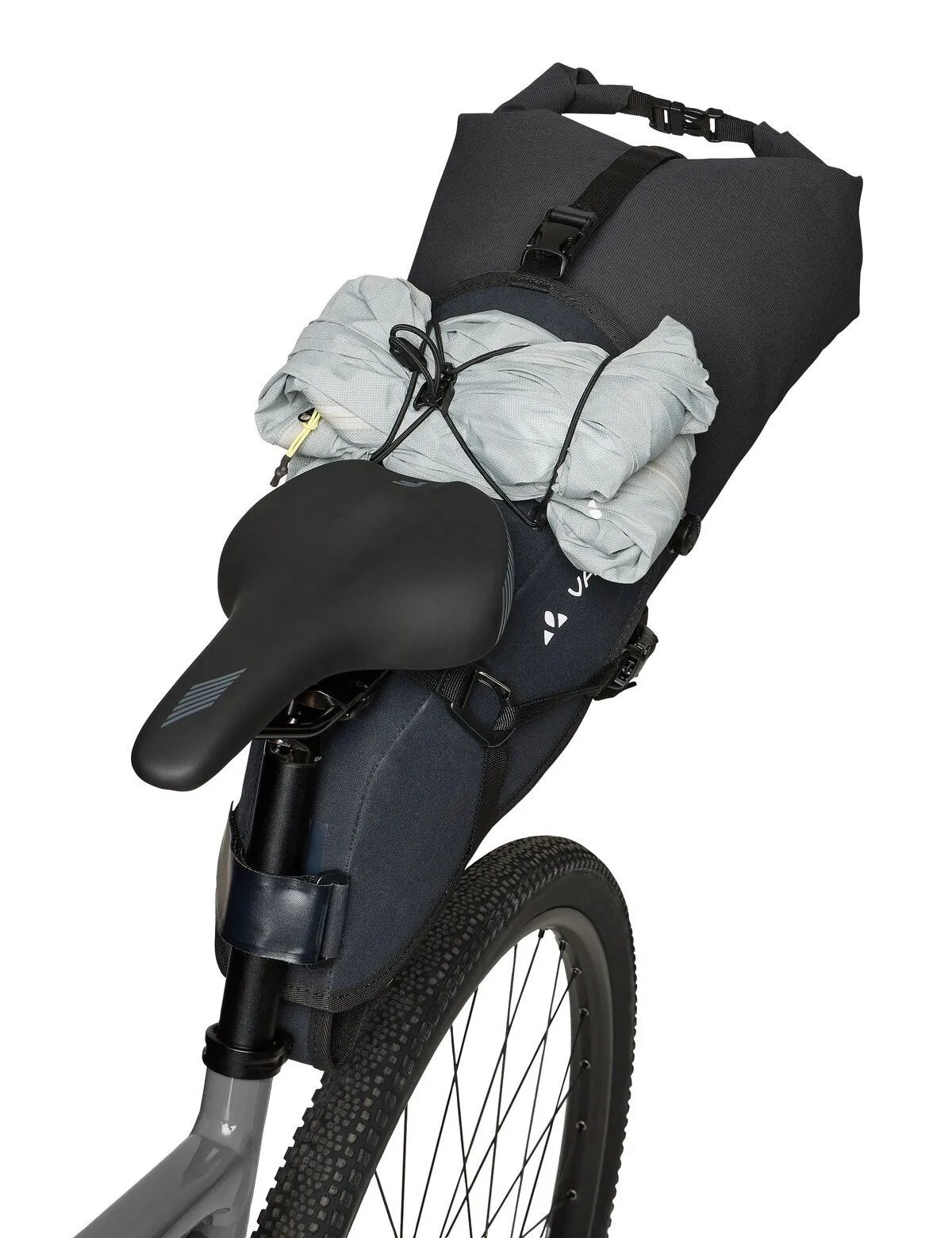 U bevestigt de robuuste houder van de Trailsaddle Cage eenvoudig onder het zadel. Deze houder kan op de fiets blijven zitten tijdens het bikepacken. De uitneembare packsack heeft een waterproof rolsluiting met klikgesp en is daardoor in volume verstelbaar. Dankzij het ontluchtingsventiel kan de inhoud van de tas optimaal worden samengedrukt. De uitneembare zak zet u vast in de houder met de verstelbare banden met klikgespen. Achter de elastische koordspin op de houder kan bijvoorbeeld een regenjack worden opgeborgen. En aan de lussen op de packsack kan een lichtje worden bevestigd.