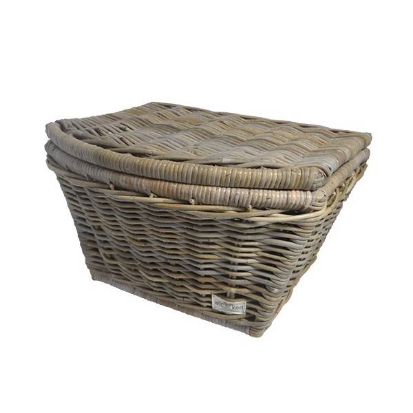 Deze fietsmand van Wicked op uw fiets levert een prachtige verschijning op! Dit model wordt ook wel een buikmand genoemd en is een handgemaakt natuurproduct van riet. Deze versie van de mand is voorzien van een deksel dat u met één hand kunt openen en sluiten. Dit biedt extra bescherming voor uw spulletjes. De riante opbergruimte van deze buikmand is maar liefst 50 liter, dus u kunt meenemen wat u maar wilt. U kunt de mand bevestigen op de voordrager van uw fiets, of aan het stuur (tiewraps en riempjes meegeleverd). De Wicked buikmand is verkrijgbaar met en zonder deksel, in de kleuren naturel en grijs.