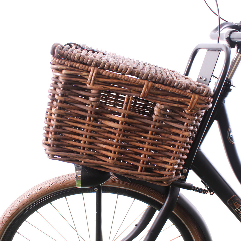 De mand is gemaakt van riet en heeft mooie details, zoals een donkerbruine sluiting in lederlook om de klep vast te zetten. Dankzij de deksel kunt u al uw spullen veilig en beschermd tegen vuil vervoeren. De inhoud van de kratmand in maat L is ca. 32 liter. U bevestigt de mand op de voordrager van uw fiets met de meegeleverde tiewraps.