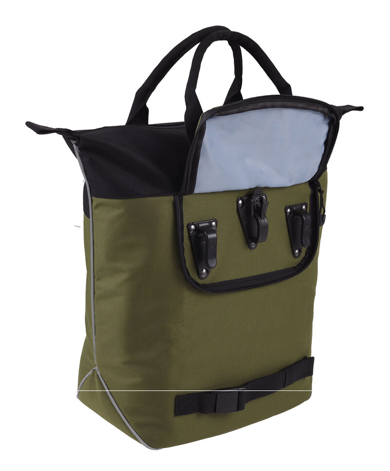 De gevoerde tas heeft een ruim hoofdvak met een ritssluiting. Binnenin zit een gevoerd steekvak en op de voorkant van de tas zit een ritsvak. De bodem van de tas is voorzien van vier bodemvoetjes, zodat tas stabiel blijft staan. De tas is bovendien makkelijk plat op te vouwen, dankzij de opklapbare bodemplaat. U draagt de tas aan de comfortabele draaggrepen. De zijkanten van de tas zijn voorzien van een opvallende reflecterende bies. En tijdens een regenbui houdt de meegeleverde fluorescerende regenhoes de inhoud van de tas droog.