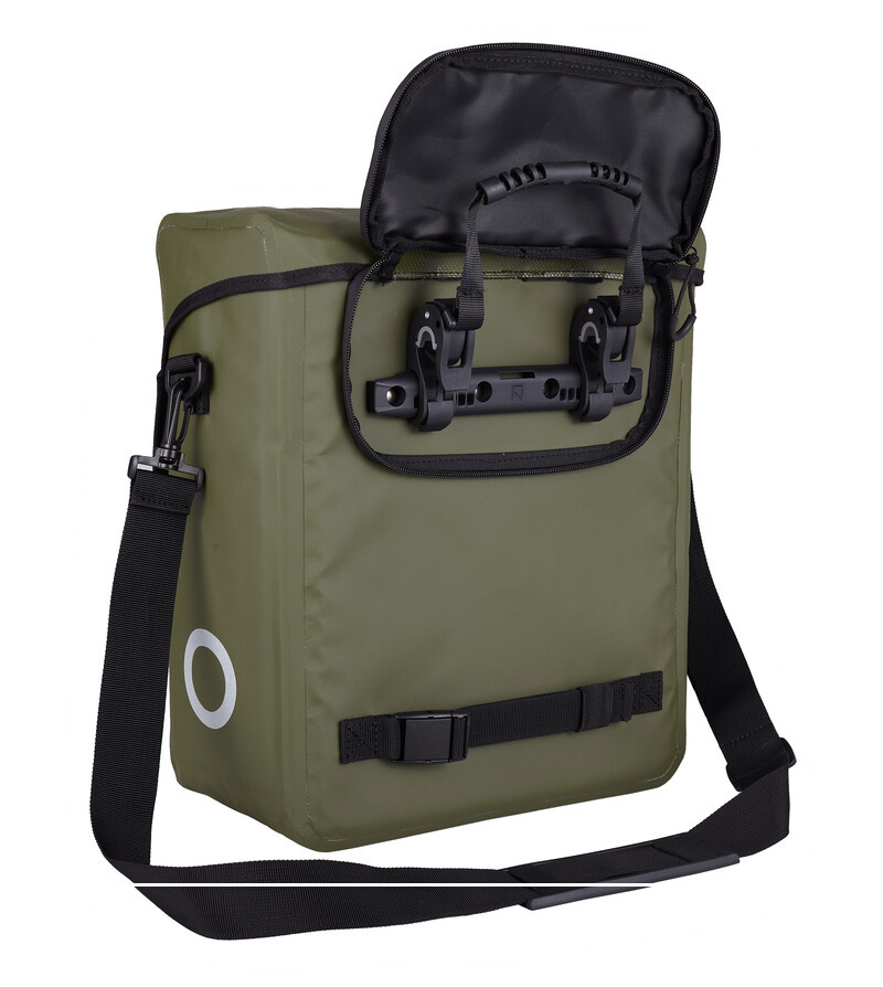 De Roubaix Enkele Tas van het Belgische merk Willex is een compacte fietstas van goede kwaliteit, gemaakt van waterdicht, tweezijdig gecoat bisonyl. De stevige legergroene tas heeft een inhoud van ca. 16 liter, een laptopvak en is te bevestigen met verstelbare haken.