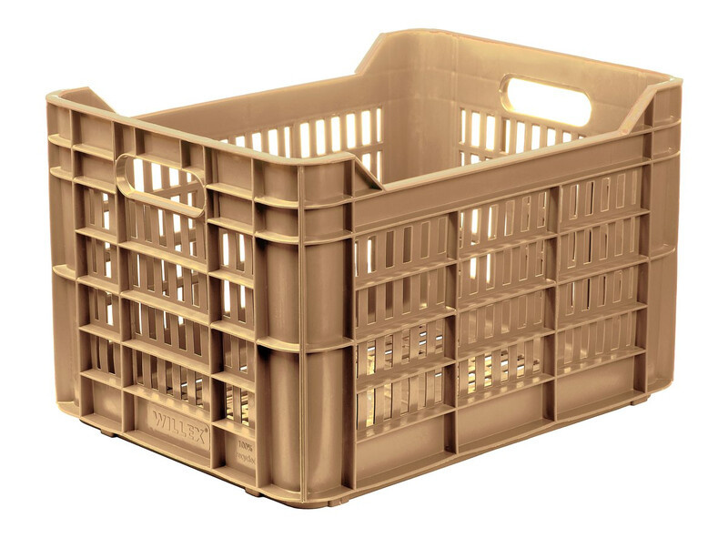 Deze duurzame beige/taupe fietskrat van het merk Willex is gemaakt van gerecycled kunststof. De fietskrat is geschikt voor elke fiets en e-bike met een bagagedrager.