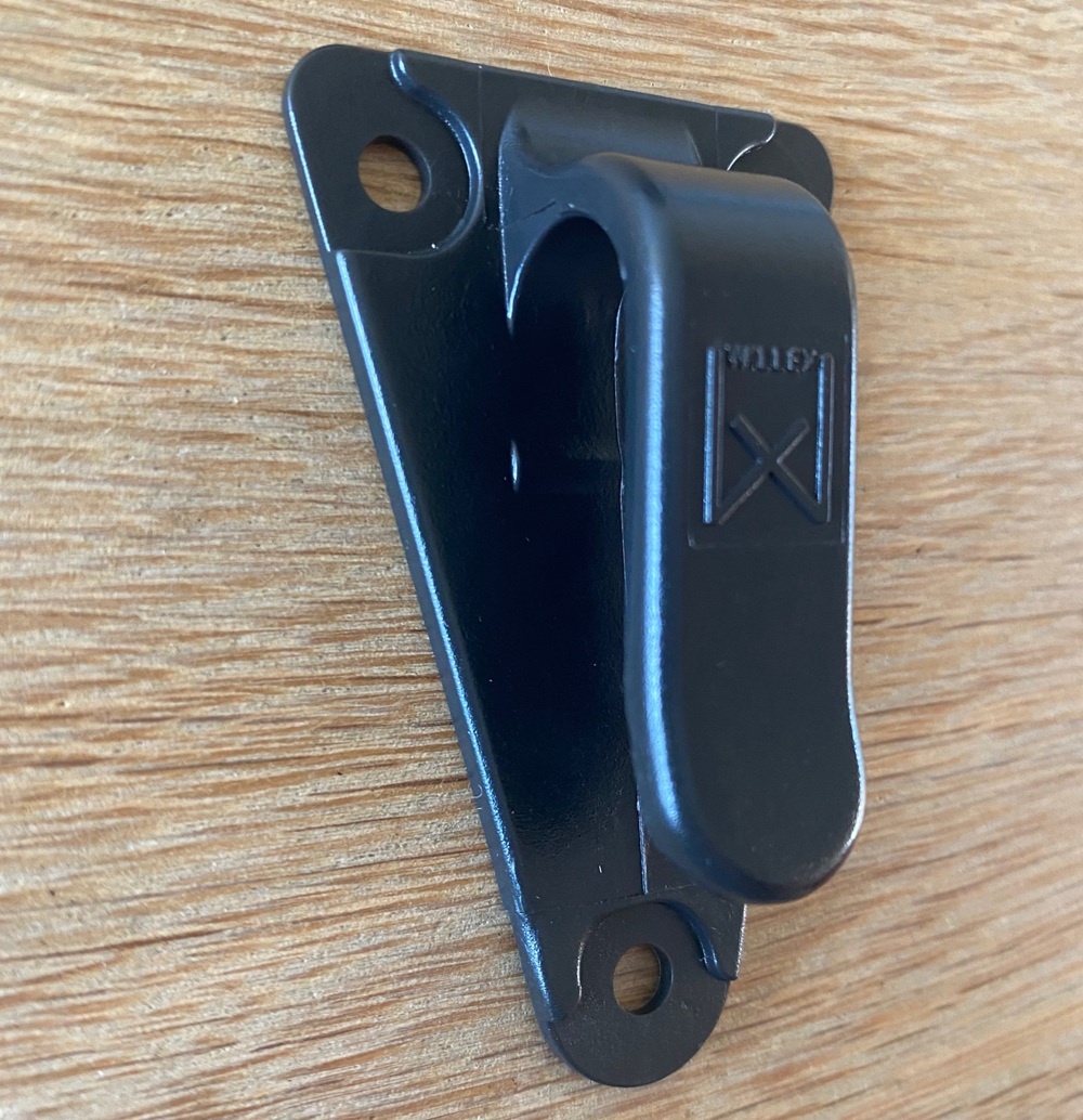 Een losse zwarte kunststof klemhaak van Willex ter vervanging van een kapotte haak. De bevestigingshaak is geschikt voor enkele fietstassen van Willex.