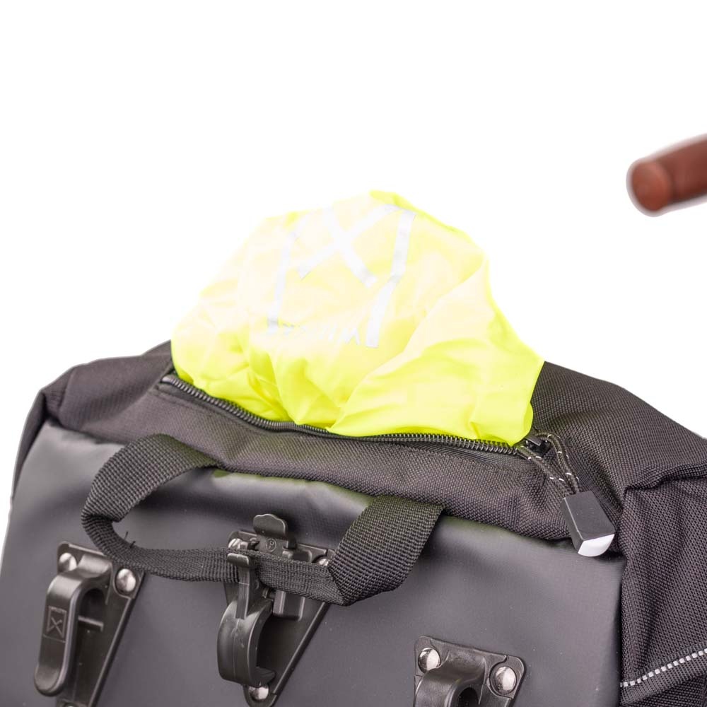 Sowieso kan deze Pakaftas 1200 tegen een buitje, want het materiaal bestaat uit waterdicht en waterafstotend polyester. En voor de grote buien en langduriger fietstochten ontvangt u - inclusief bij uw bestelling - een grote, accentrijke regenhoes, die fraai is opgeborgen in een ritsvak.