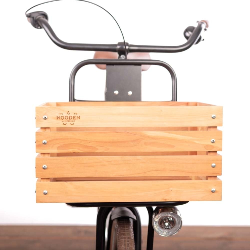 Een mooie houten fietskrat van het merk Wooden Amsterdam. De stevige, grote krat is gemaakt van duurzaam geproduceerd perenhout en gaat lang mee.