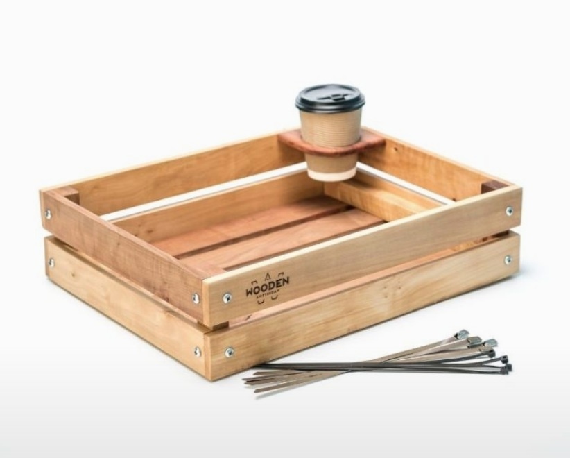 Deze Urban Explorer fietskrat van het Nederlandse merk Wooden Amsterdam is gemaakt van duurzaam perenhout. De lage houten krat heeft een hippe bekerhouder, zodat een drankje altijd binnen handbereik is, ook op de fiets.