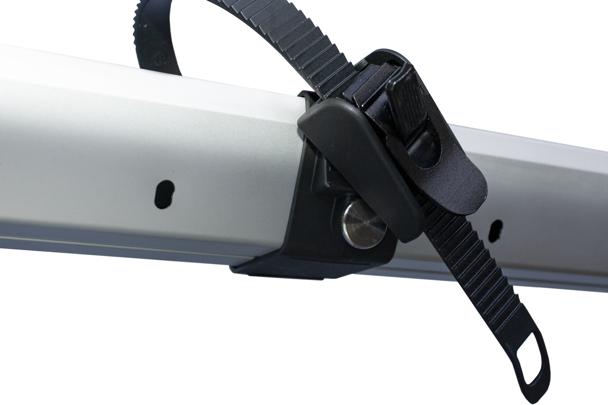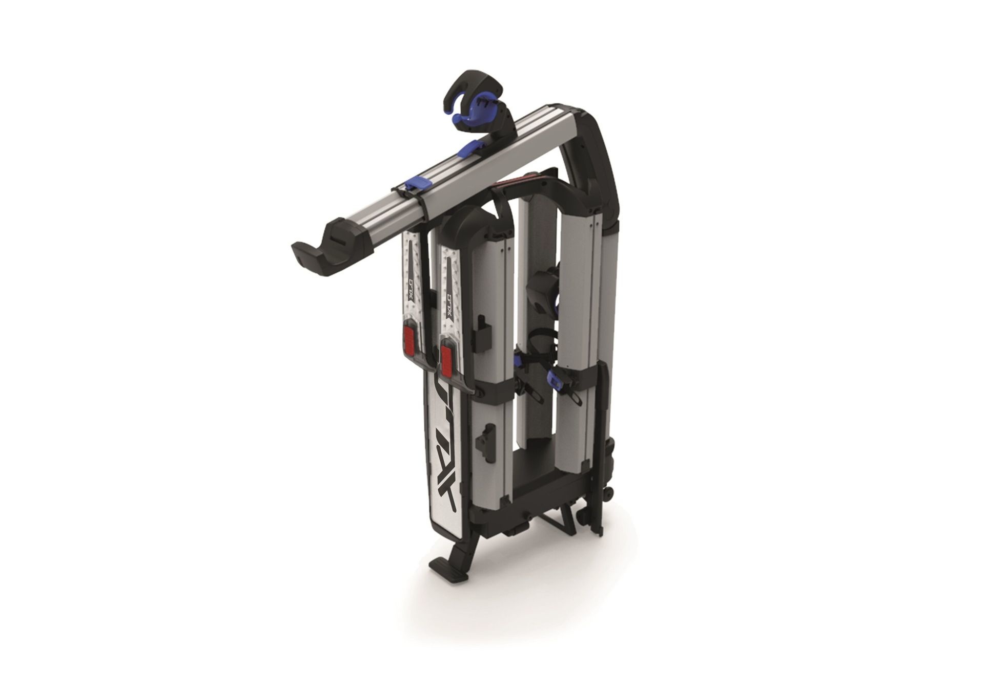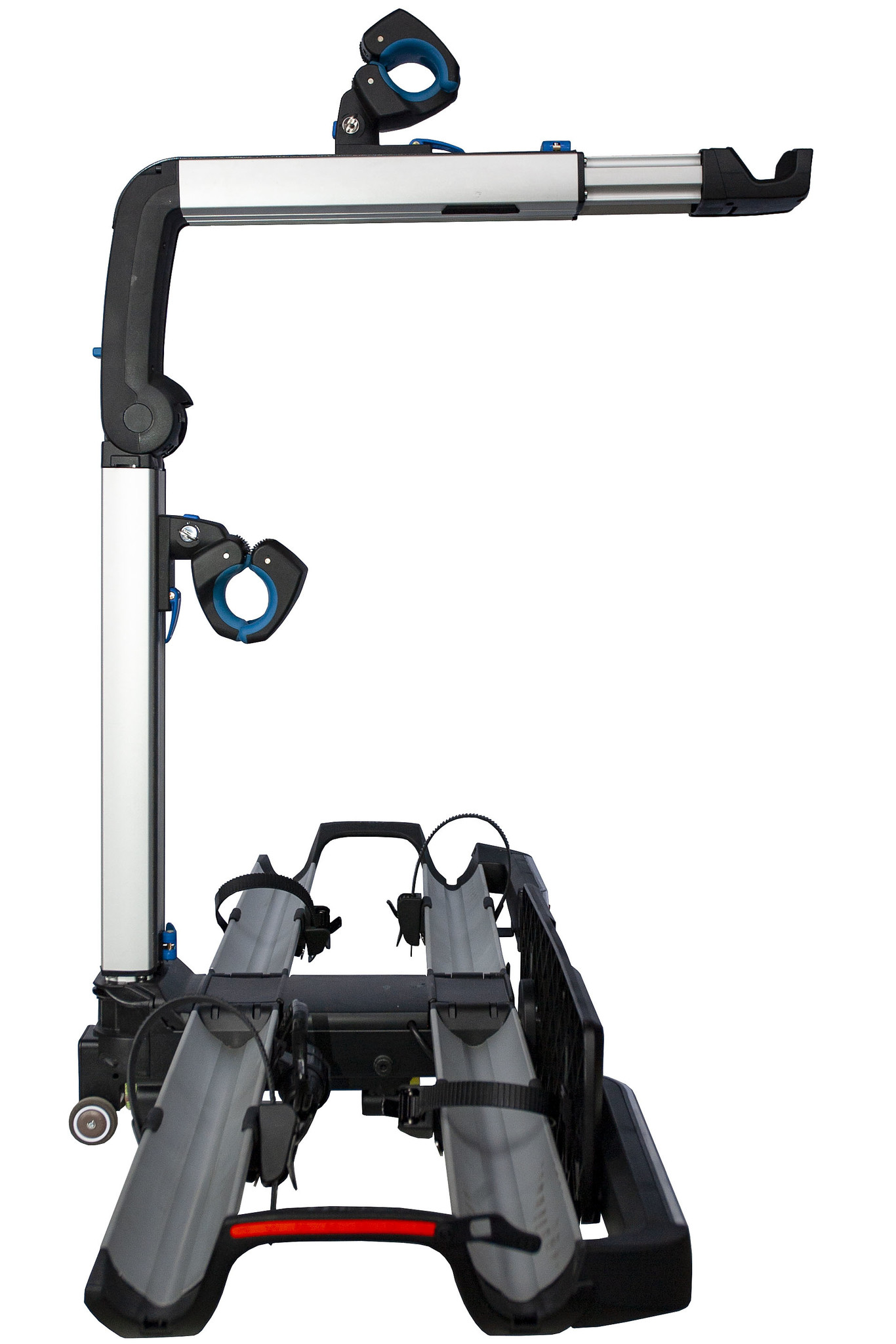 Na de bevestiging op de trekhaak kunt u de fietsdrager uitvouwen. De twee vleugels worden bij elkaar gehouden door een clipje. Maak deze los zodat u de vleugels kunt uitvouwen. Als de vleugels in de juiste positie staan, borgen deze automatisch en hoort u een klik.