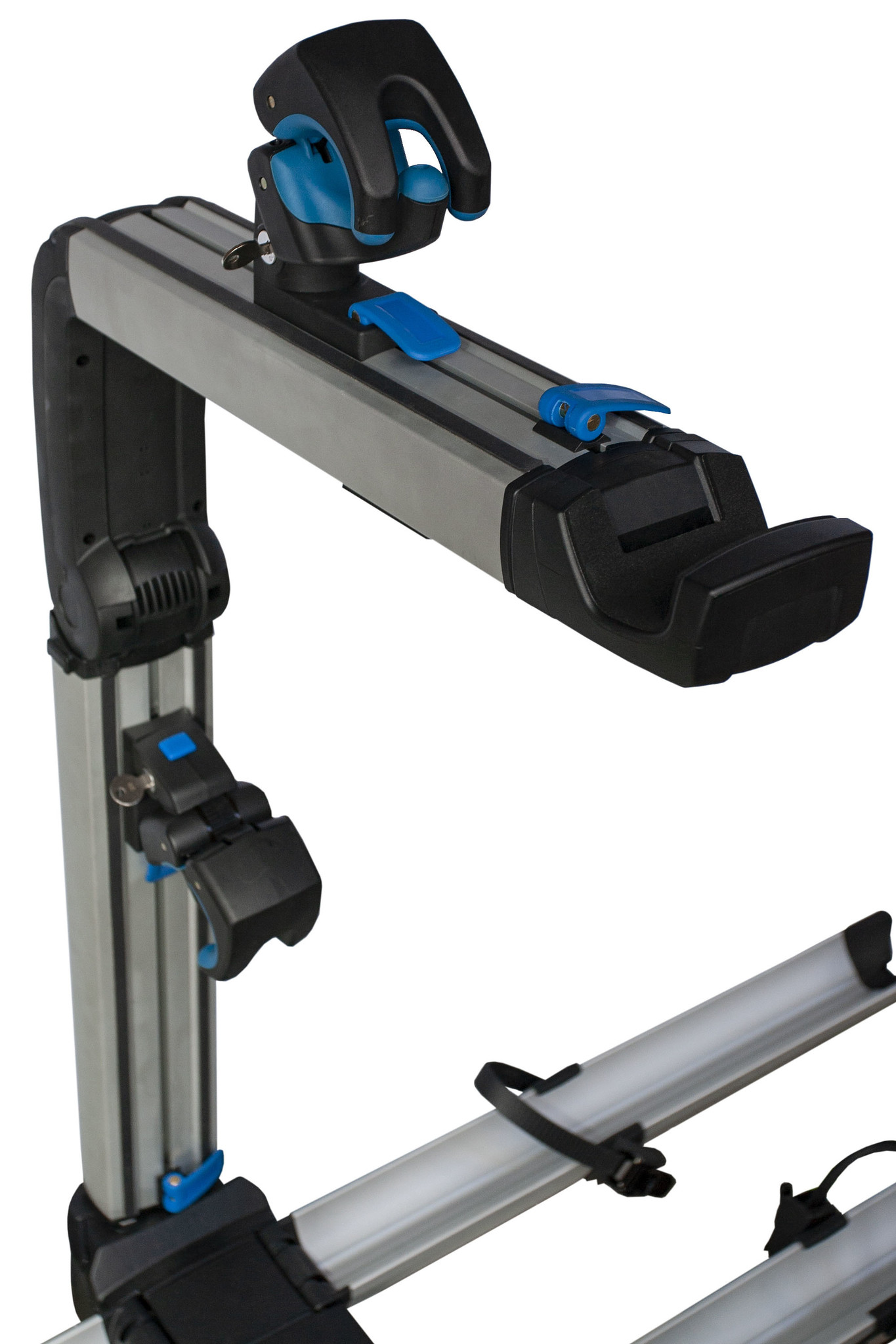 De verstelbare houders waar de wielen op rusten, kunt u afstemmen op de grootte van uw fiets. U zet de wielen van uw fiets gemakkelijk vast via de wielriemen. De framebuis van de fiets kunt u eenvoudig vastzetten in de daarvoor bestemde frameklem, die automatisch opent. De drager is beveiligd met een slot en ook de frameklemmen kunnen worden vergrendeld, om diefstal van de fiets te voorkomen. De bevestigingsklemmen zijn geschikt voor framebuisdiameters van 25 tot 80 mm en voor alle soorten frames, inclusief carbon frames.